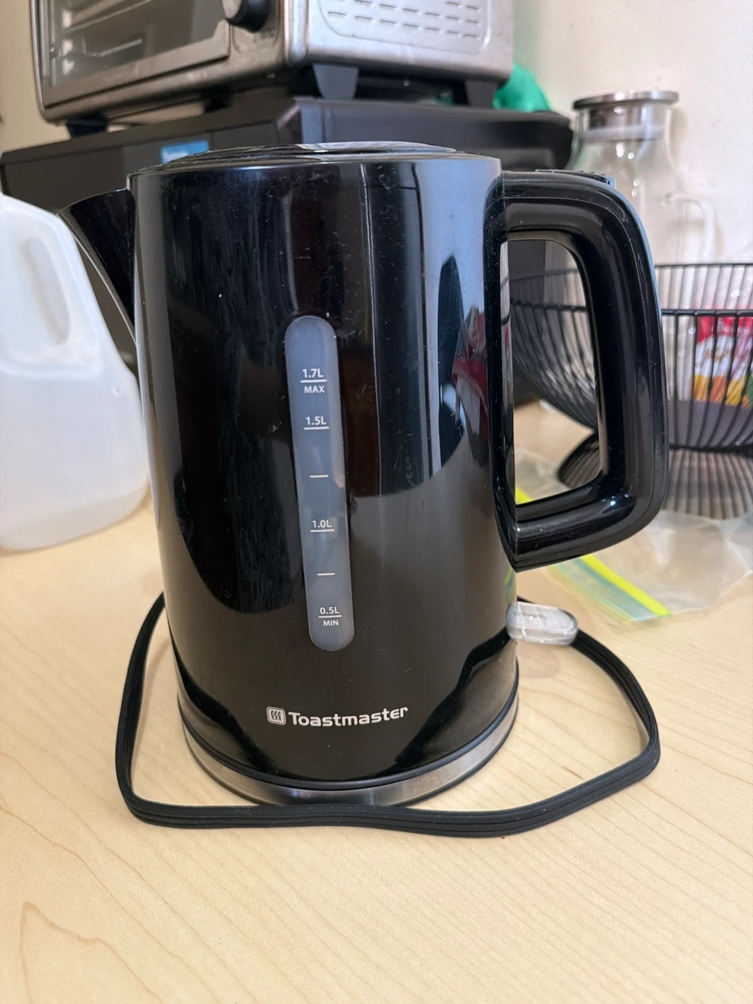 Black electric kettle by Toastmaster. It has a 1.7L maximum capacity. Water level indicator clearly shows measurements from 0.5L to 1.7L. Perfect for quickly heating water for tea or coffee!