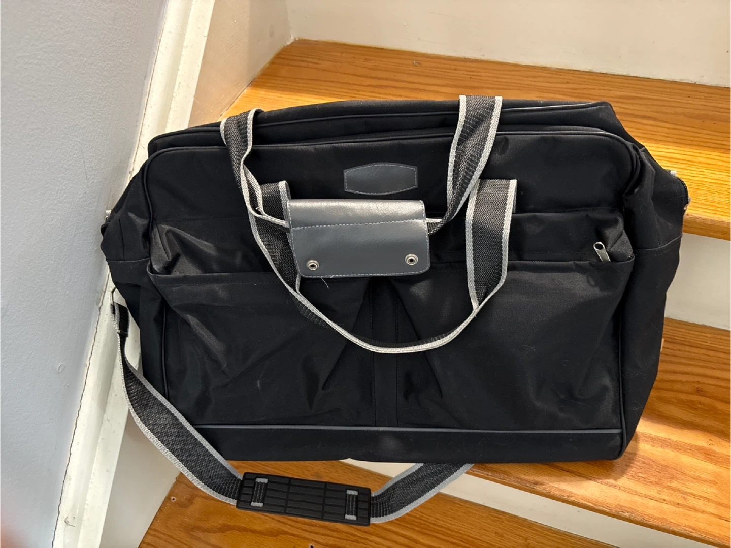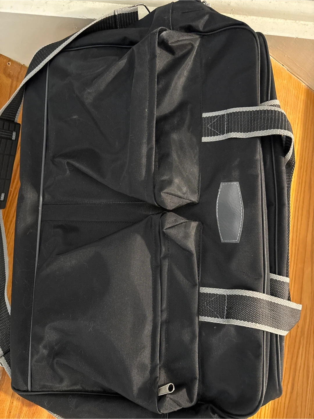 This black duffle bag is made of durable nylon. It features multiple pockets and a detachable shoulder strap for comfortable carrying. It's a practical choice for weekend trips or gym sessions, good size for carry on bags.