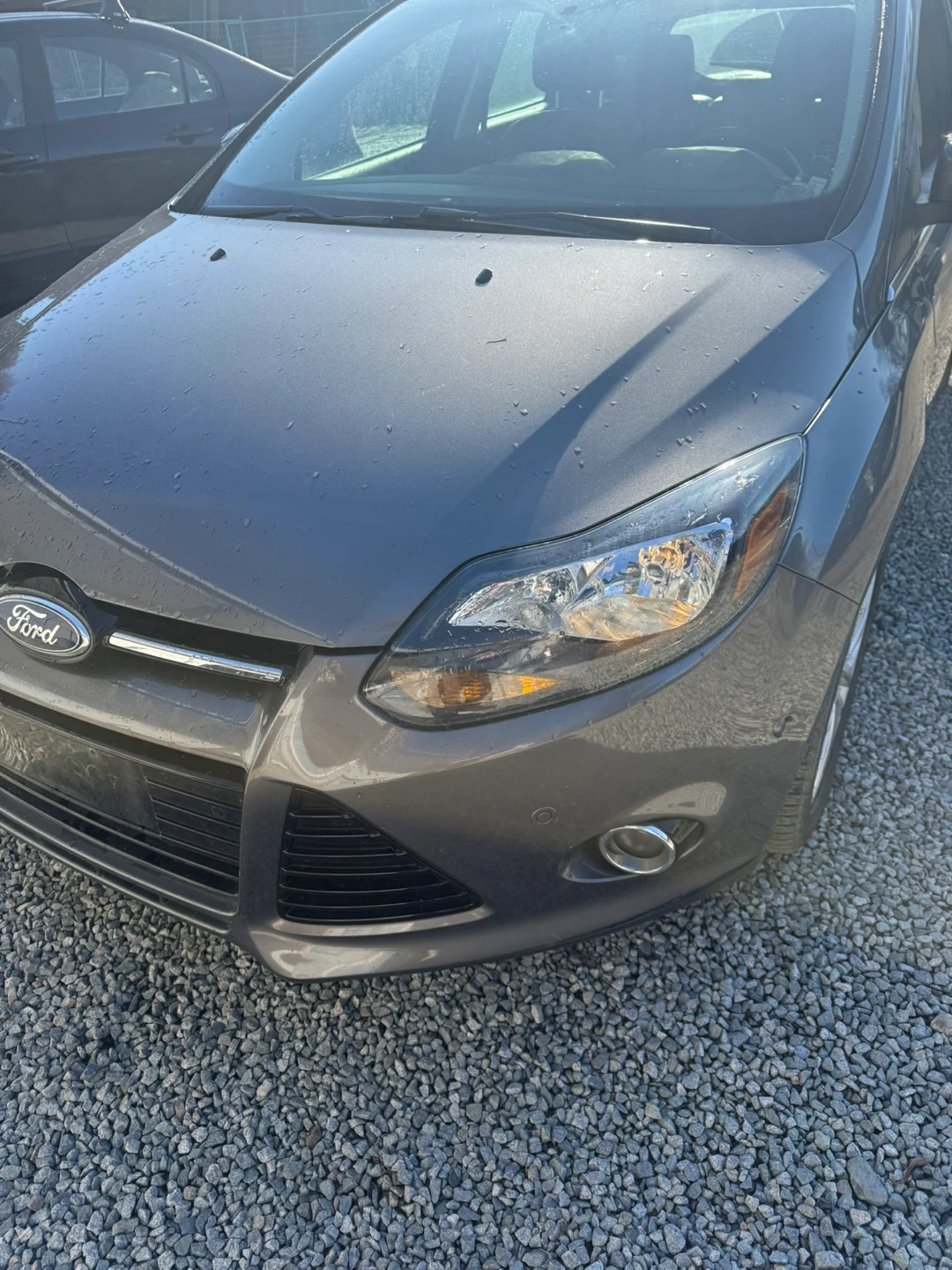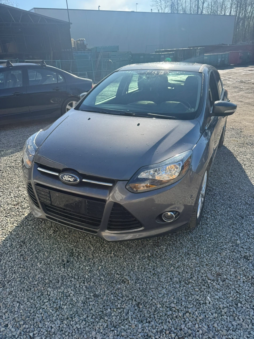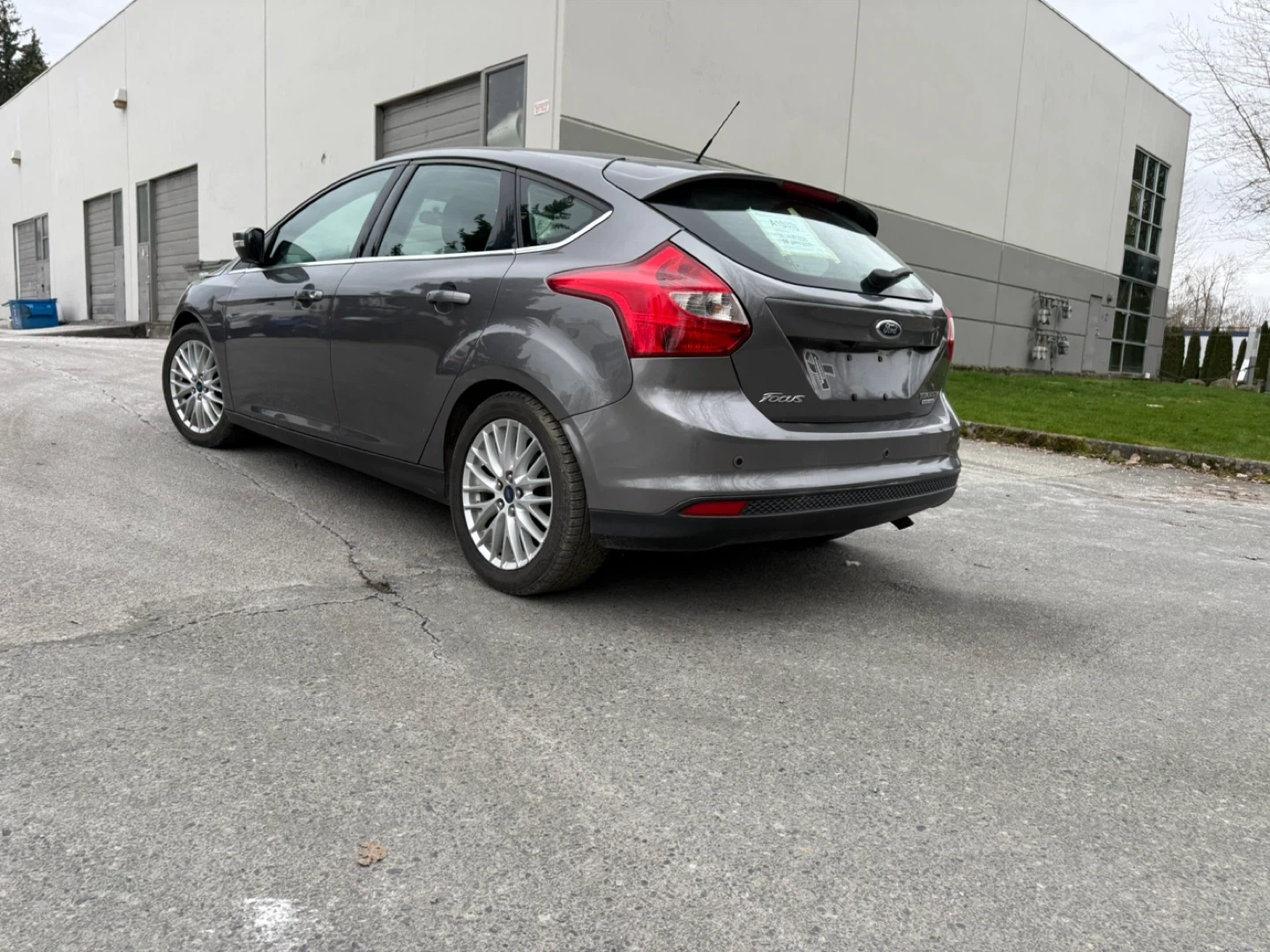 This is a 2013 Ford Focus Titanium with Flex Fuel capability. It's a four-door hatchback with a grey exterior. The interior features black leather seats.