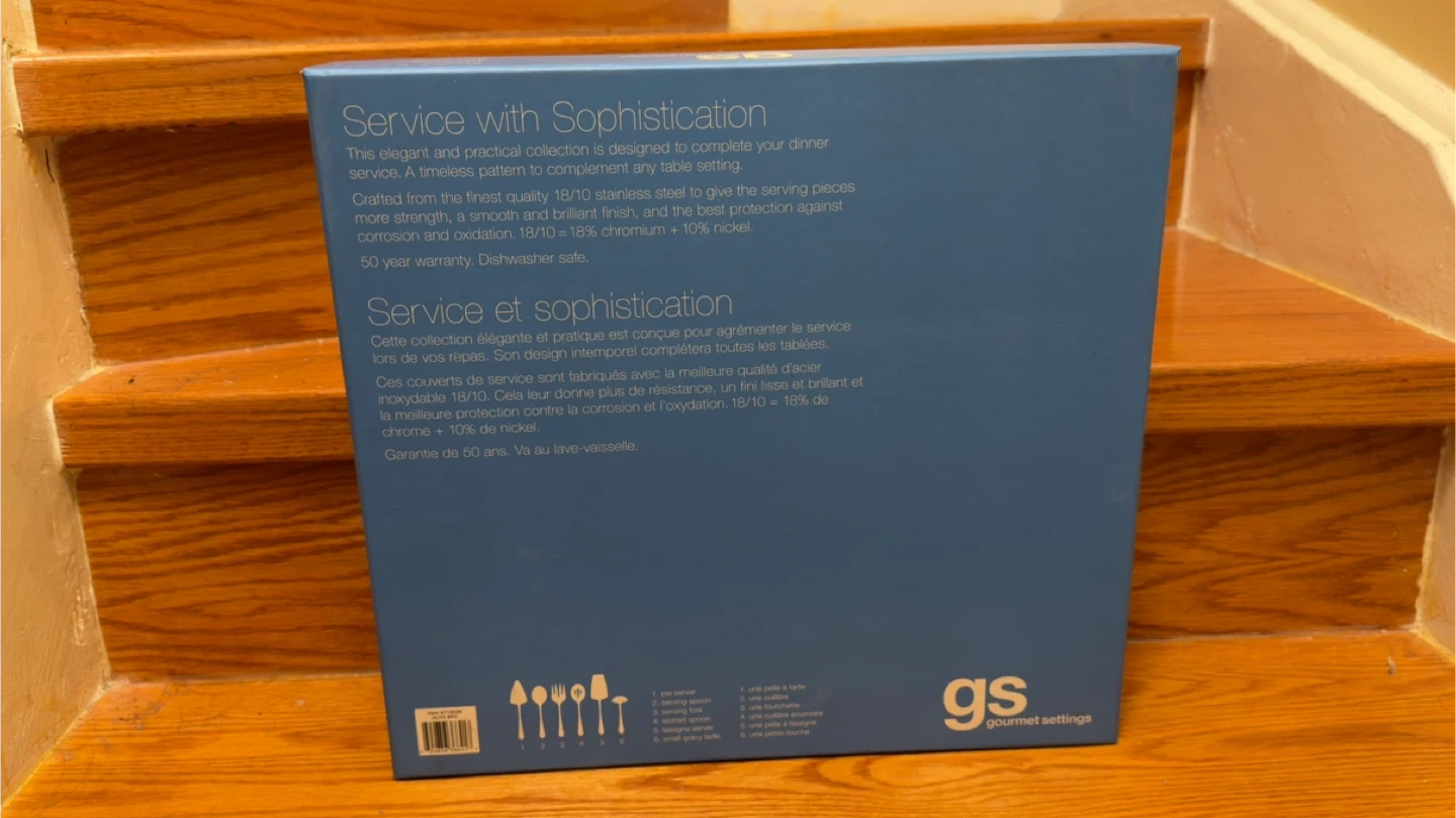 Brand new Gourmet Settings 6-piece serving set, still sealed in original packaging. Crafted from premium 18/10 stainless steel for durability, a smooth polished finish, and excellent resistance to rust and corrosion. Timeless design that complements any table setting.