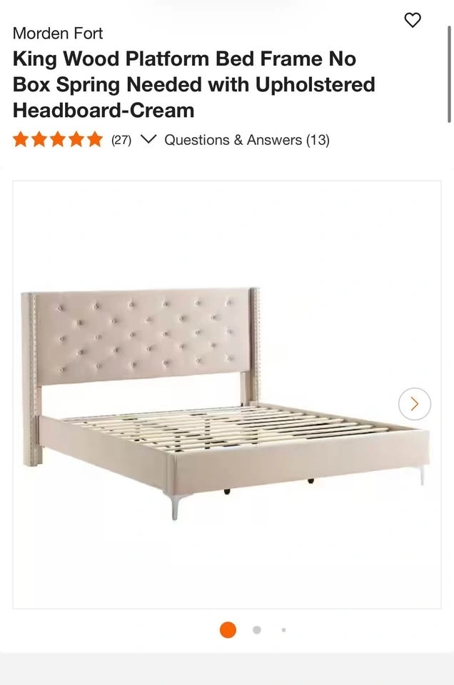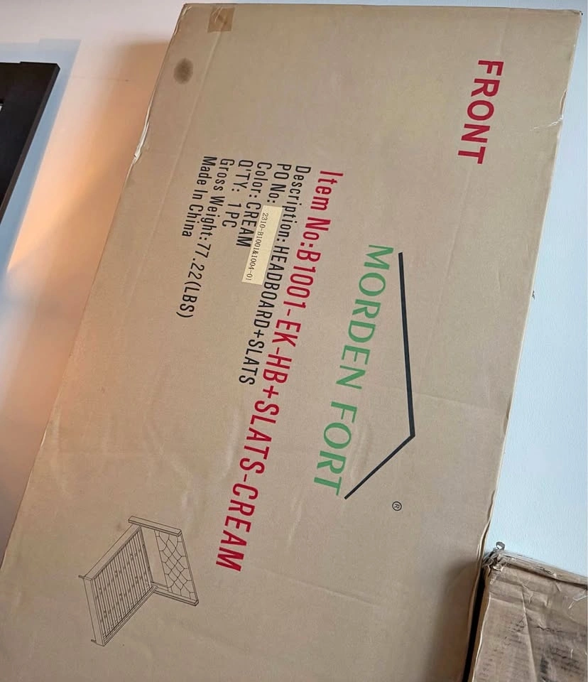 Unopened King Wood Platform Bed Frame. No box spring needed. Upholstered headboard in cream. Dimensions: H 40.7 in, W 78.5 in, D 86.5 in. Pick up at Battleford and Glen Erin Drive, Mississauga.