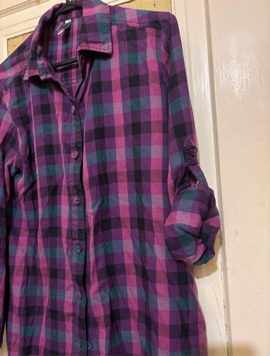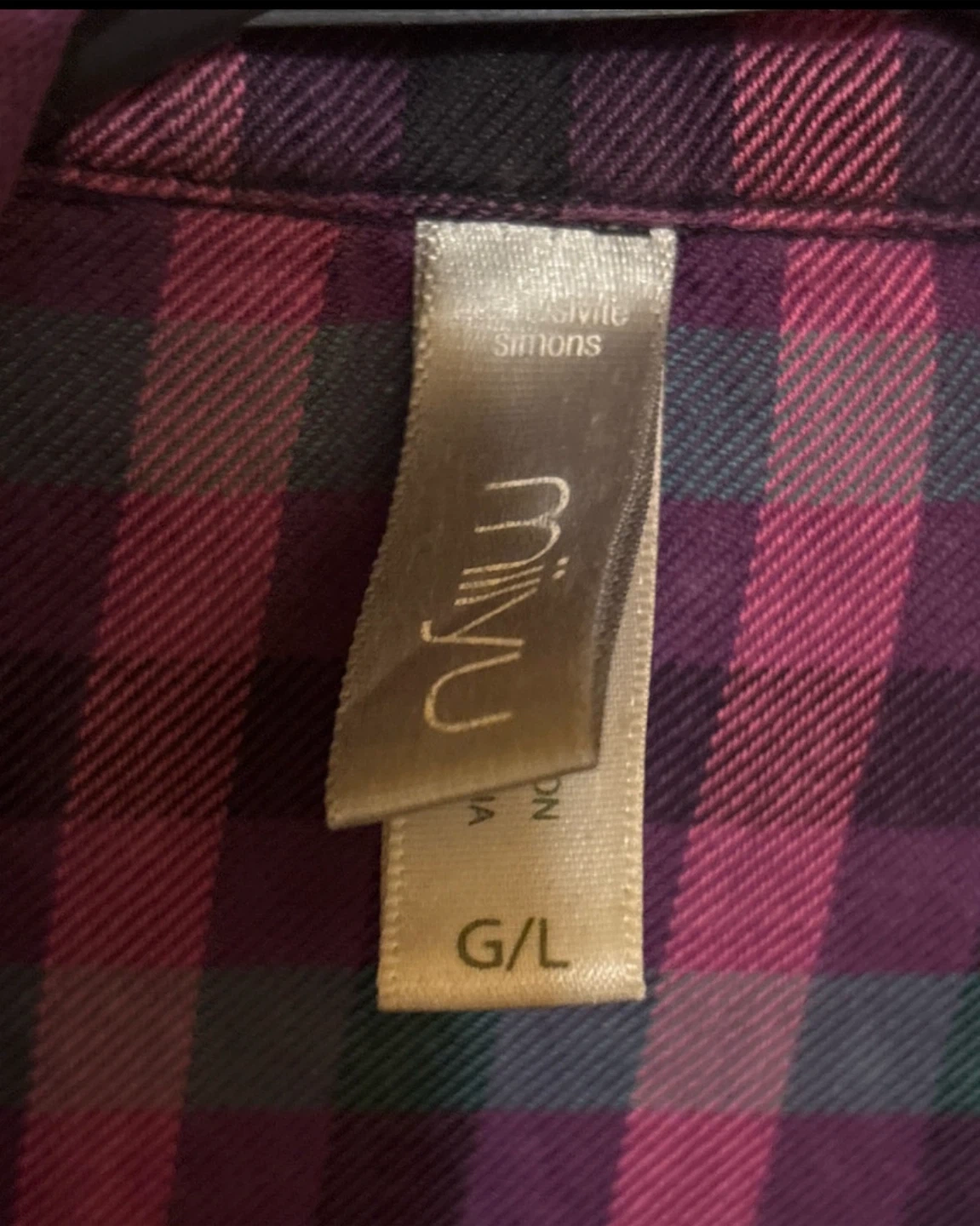 This is a used Miyu purple plaid flannel in size large (G/L). It's perfect for layering or wearing on its own for a casual, comfy look. I'm cleaning out my closet so you can add this to your wardrobe!