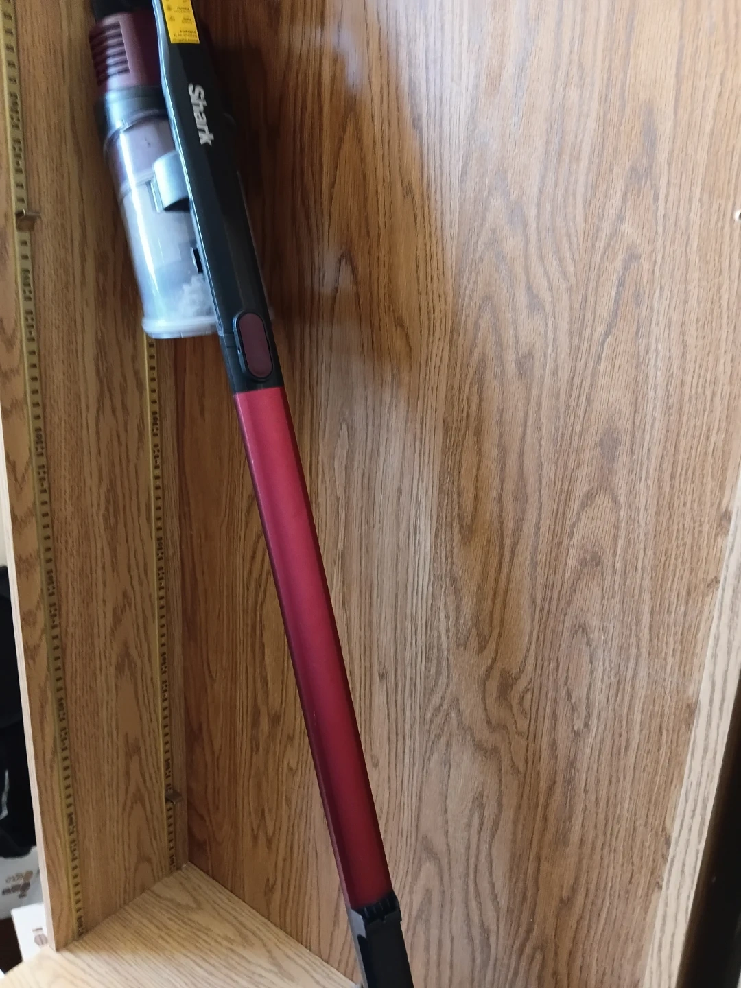 Shark stick vacuum. It's a red and black model. It comes with a dustbin. This stick vacuum is great for quick cleanups around the house!