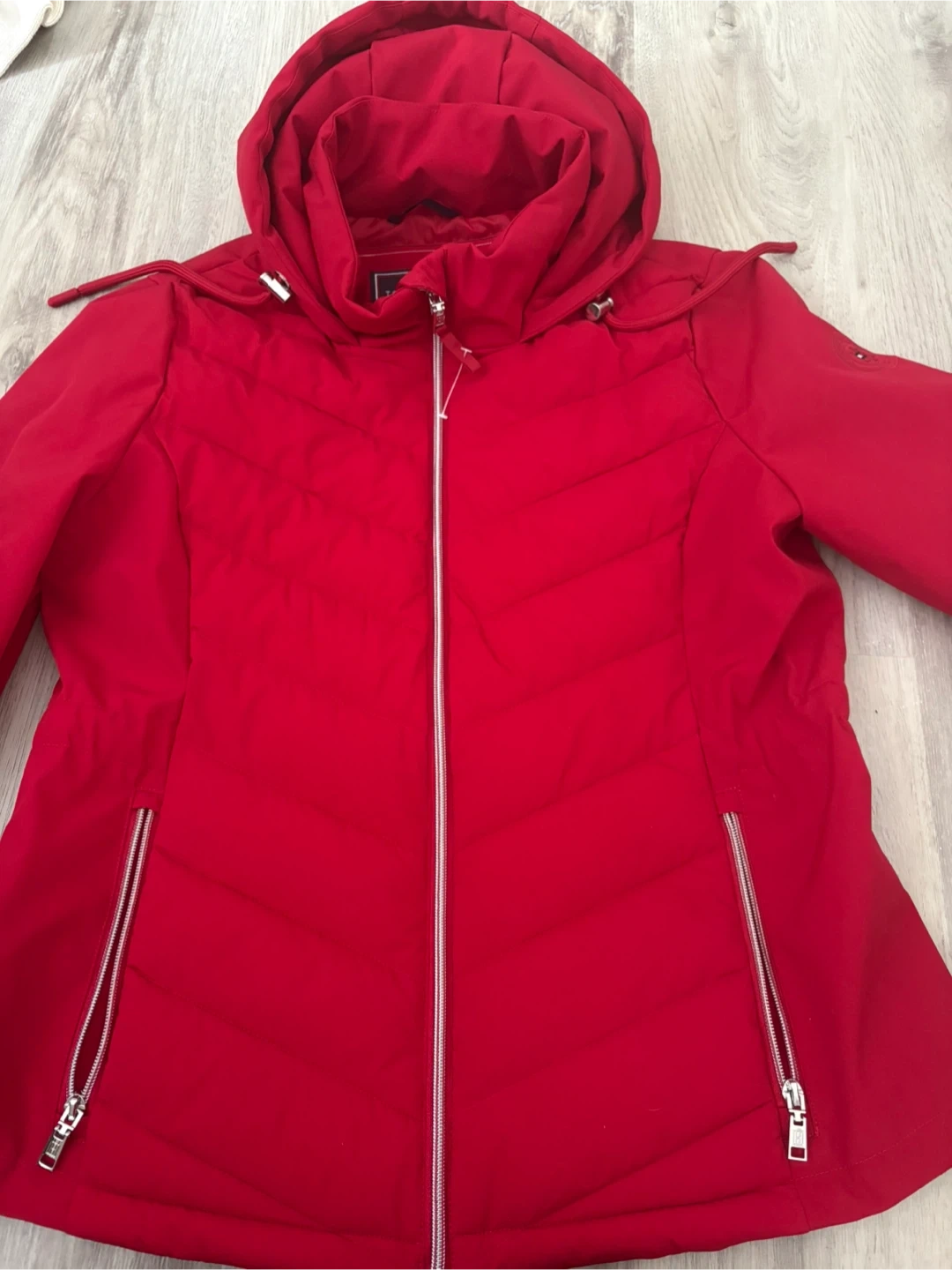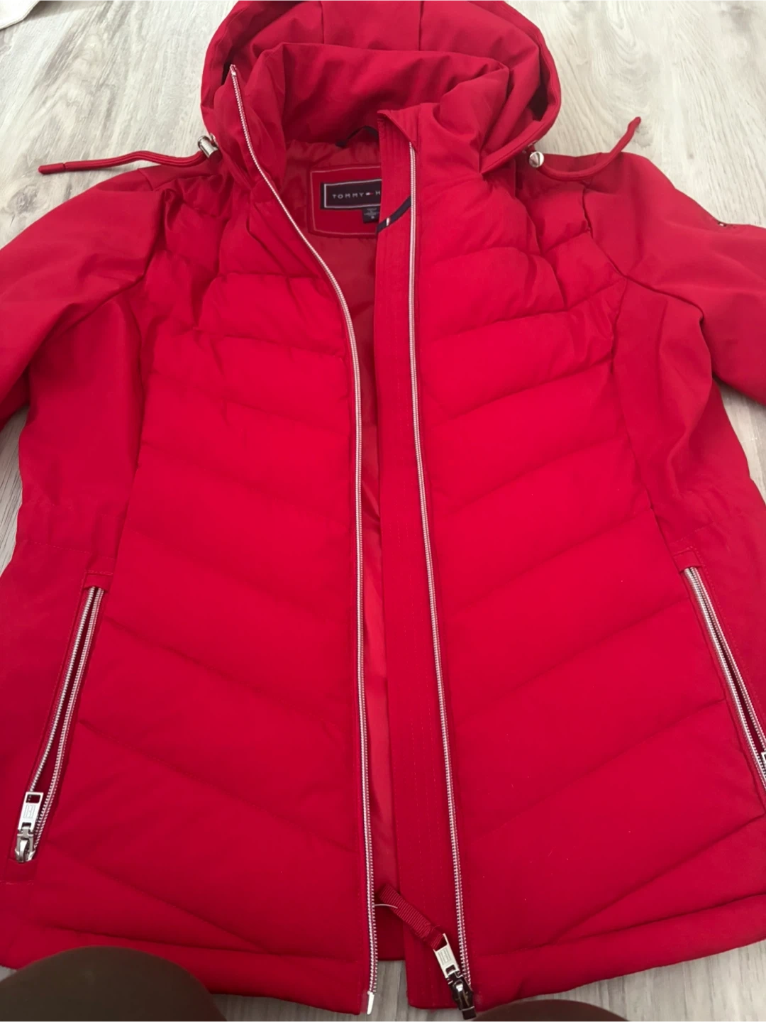 This red Tommy Hilfiger hooded puffer jacket is ready for cooler weather! It features a full zip front and zippered pockets. Size LG