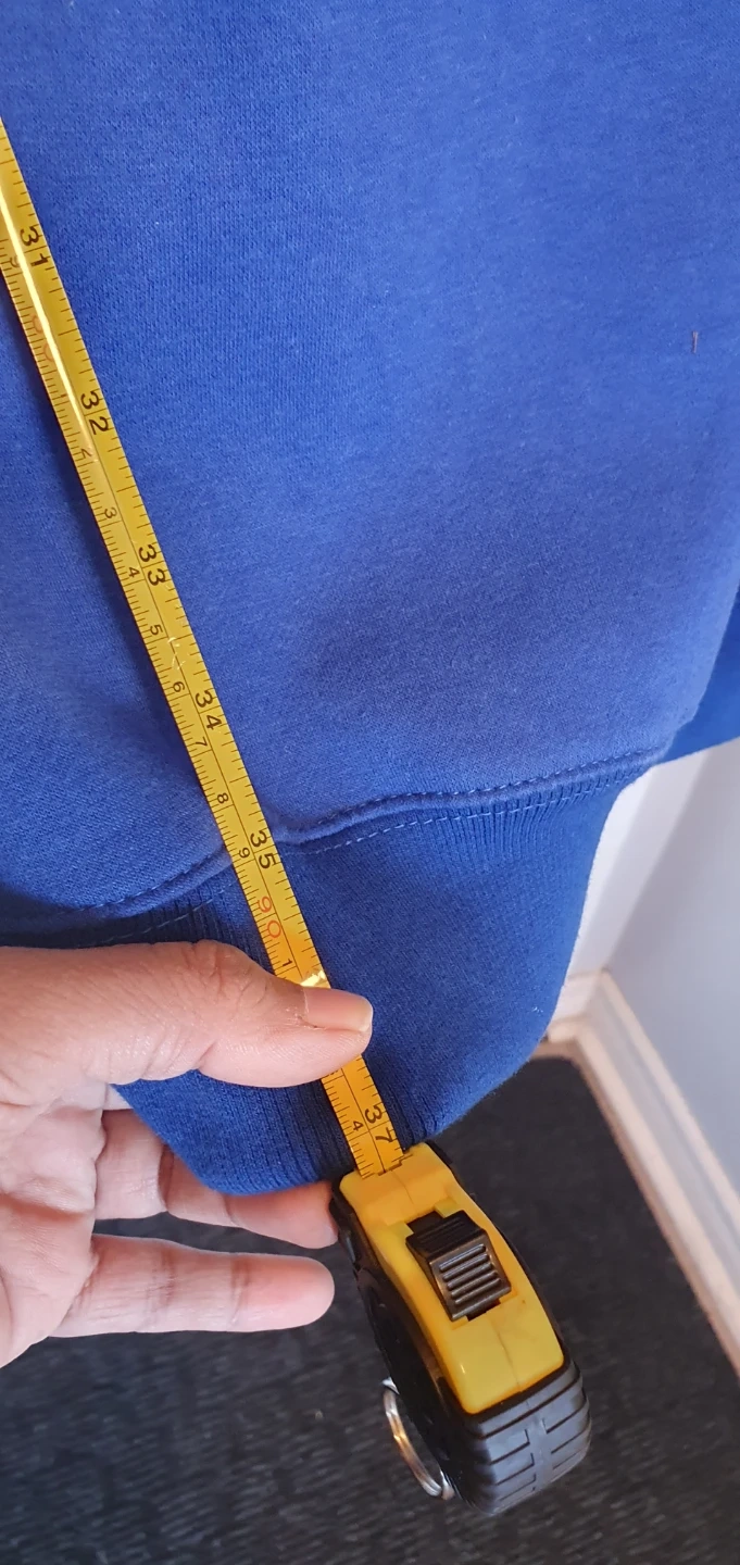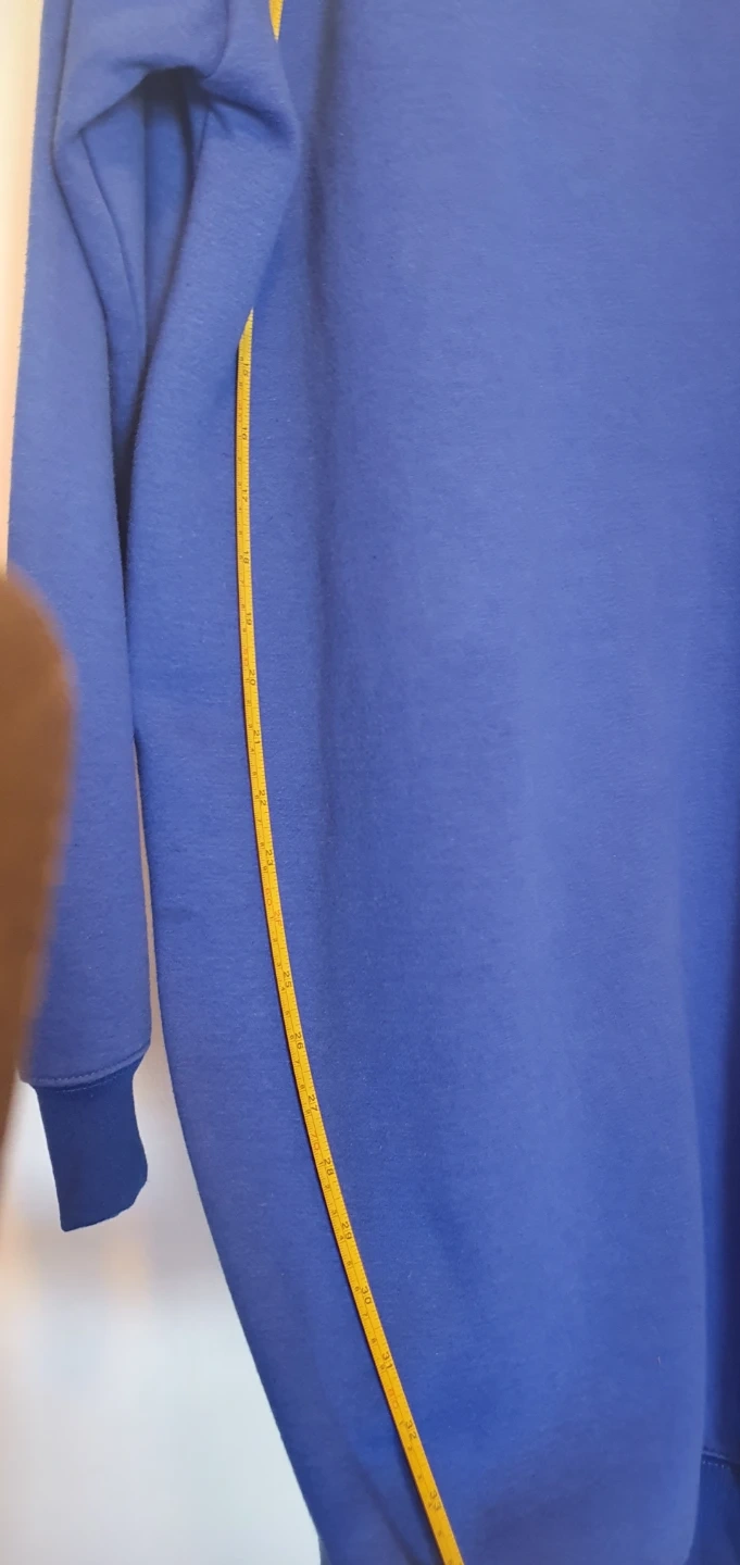 This is a blue hoodie dress with the "Mr. MOTO MOTO" graphic on the back. It has a front pouch pocket and a drawstring hood. The material is a soft fleece blend, perfect for casual wear. Length is approximately 37 inches.