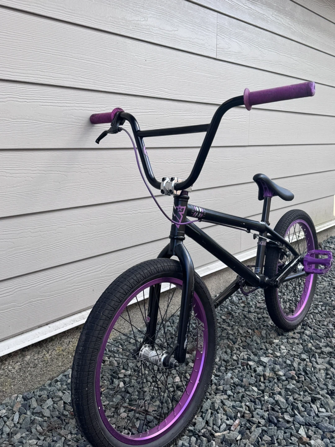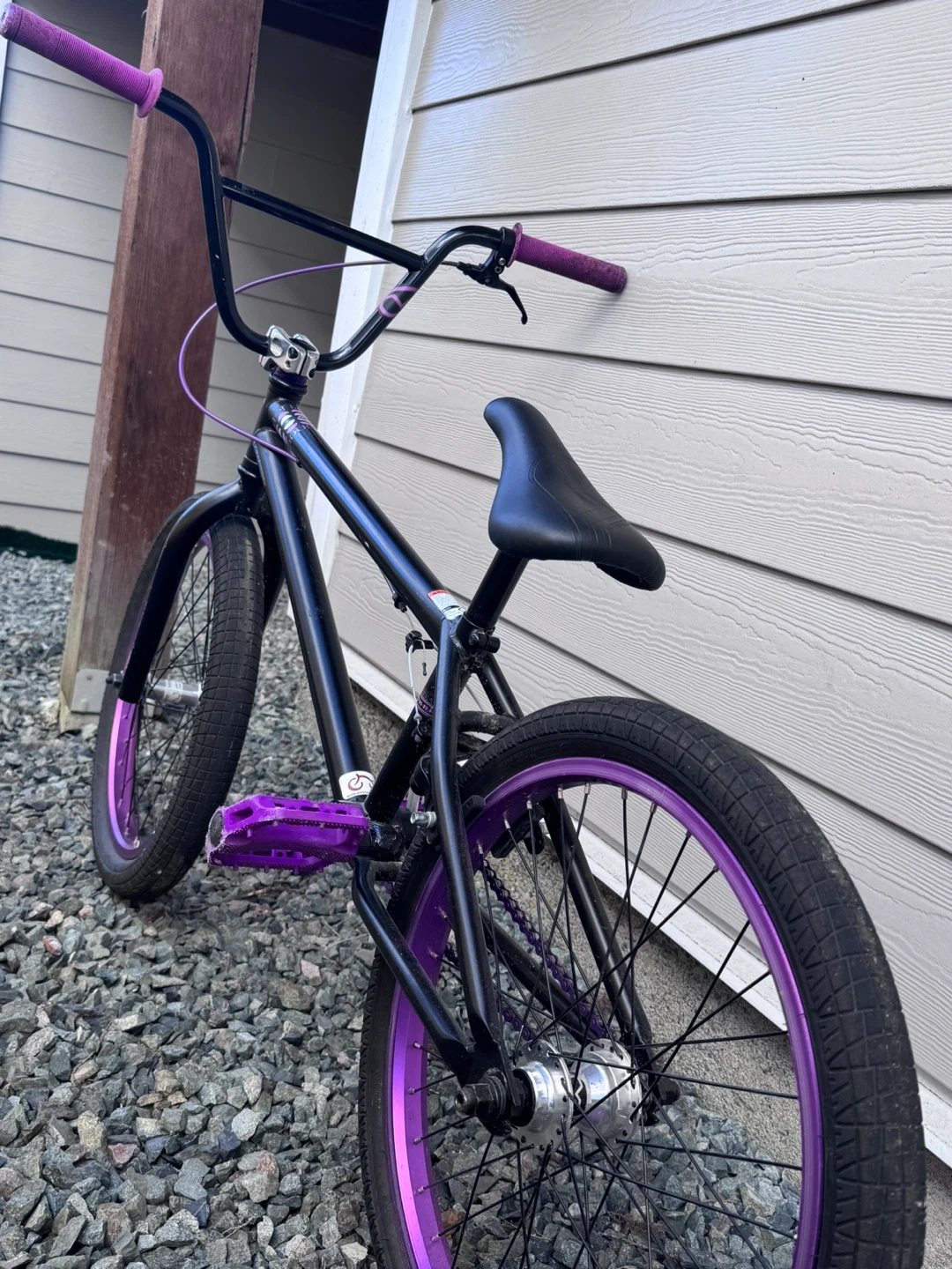 This is a black BMX bike with purple accents on the rims, pedals, and grips. It's a great bike for tricks and street riding. Ready for fun!