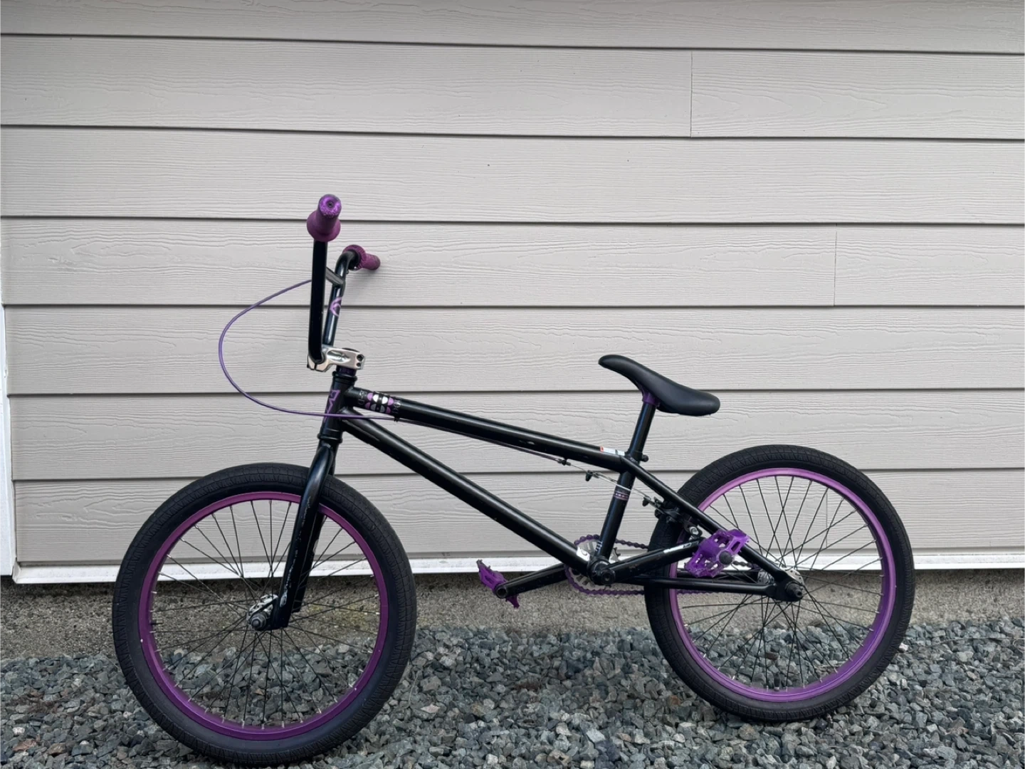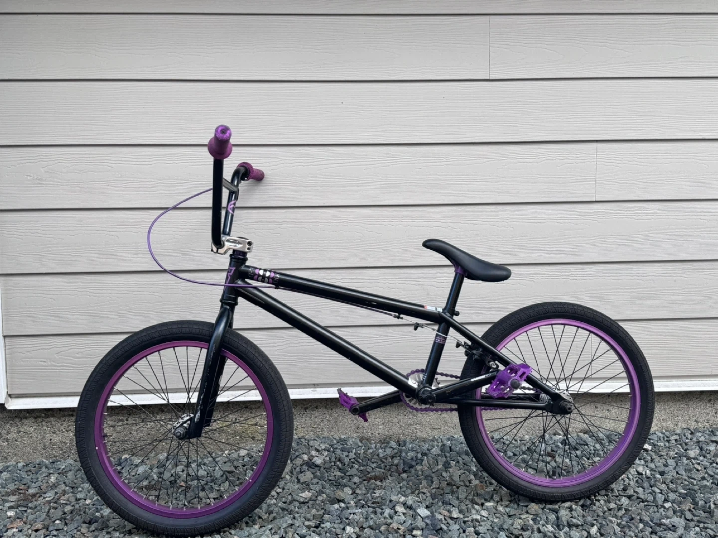 This is a black BMX bike with purple accents on the rims, pedals, and grips. It's a great bike for tricks and street riding. Ready for fun!