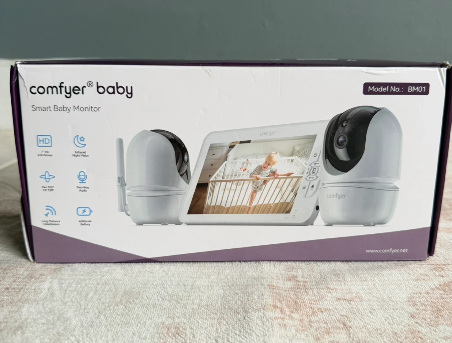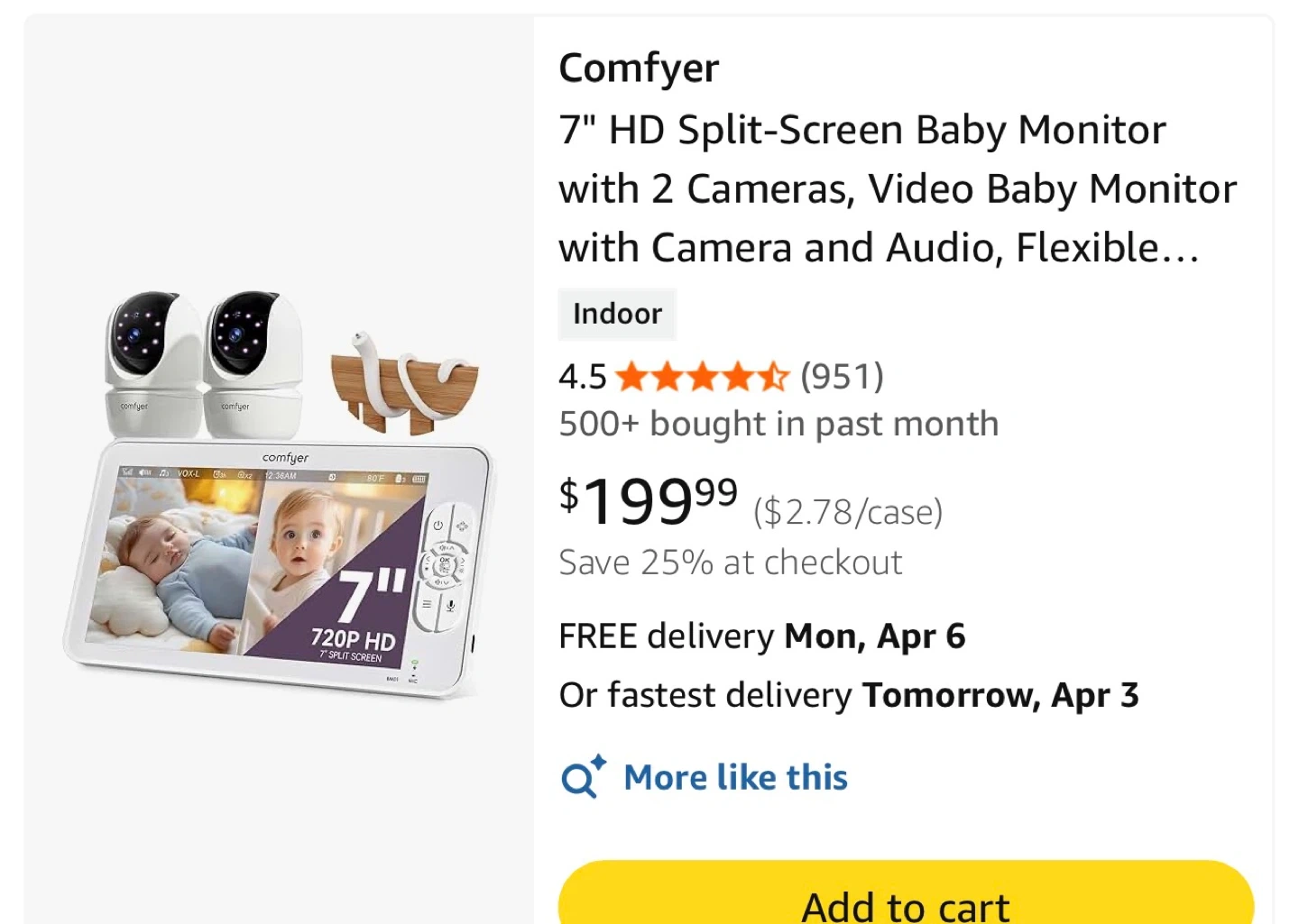 This Comfyer Baby smart baby monitor system comes with a 7" HD LCD screen and two cameras. It offers infrared night vision and two-way audio. The monitor has a rechargeable 4000mAh battery.