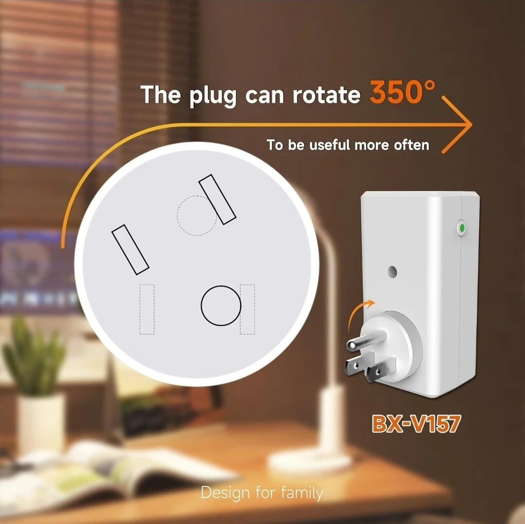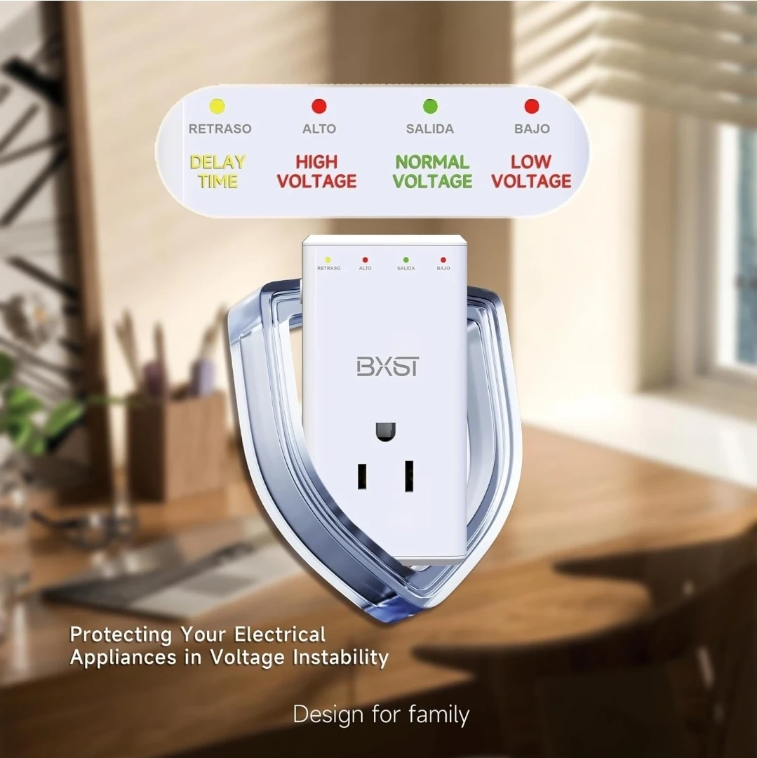 This BXST voltage protector is designed to safeguard household appliances. It features adjustable delay times of 15S/30S/3M and protects against high and low voltage. The plug rotates 350° for convenient use.