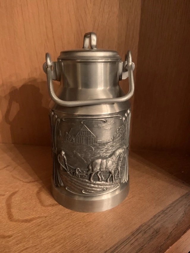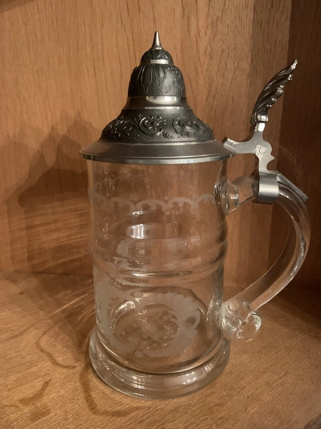 6 tall glasses 8” sold 6 small shot glasses 3.75” $10 each 2 cups 4.5” sold Large glass and pewter stein 11” $60 Small glass and pewter stein 8.5” $50 Milk jug 7” sold. Vintage, Antiques. For Sale By: Owner.
