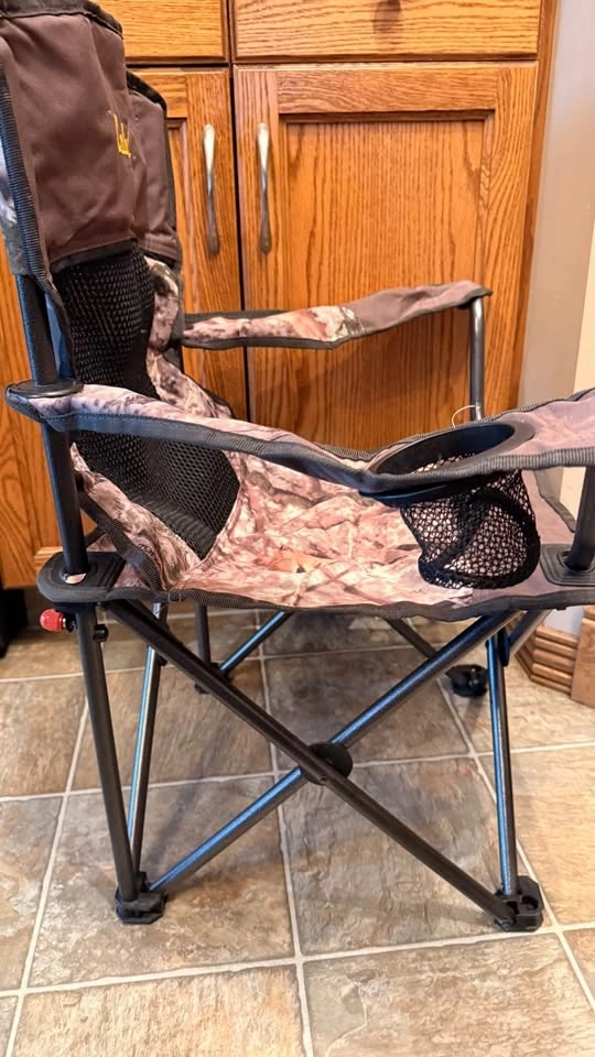Durable Cabela's folding chair with Zonz Woodlands camouflage pattern and breathable black mesh backrest. Frame is sturdy dark metal with integrated cup holder in right armrest. Matching camo carrying bag with shoulder strap included for easy transport.