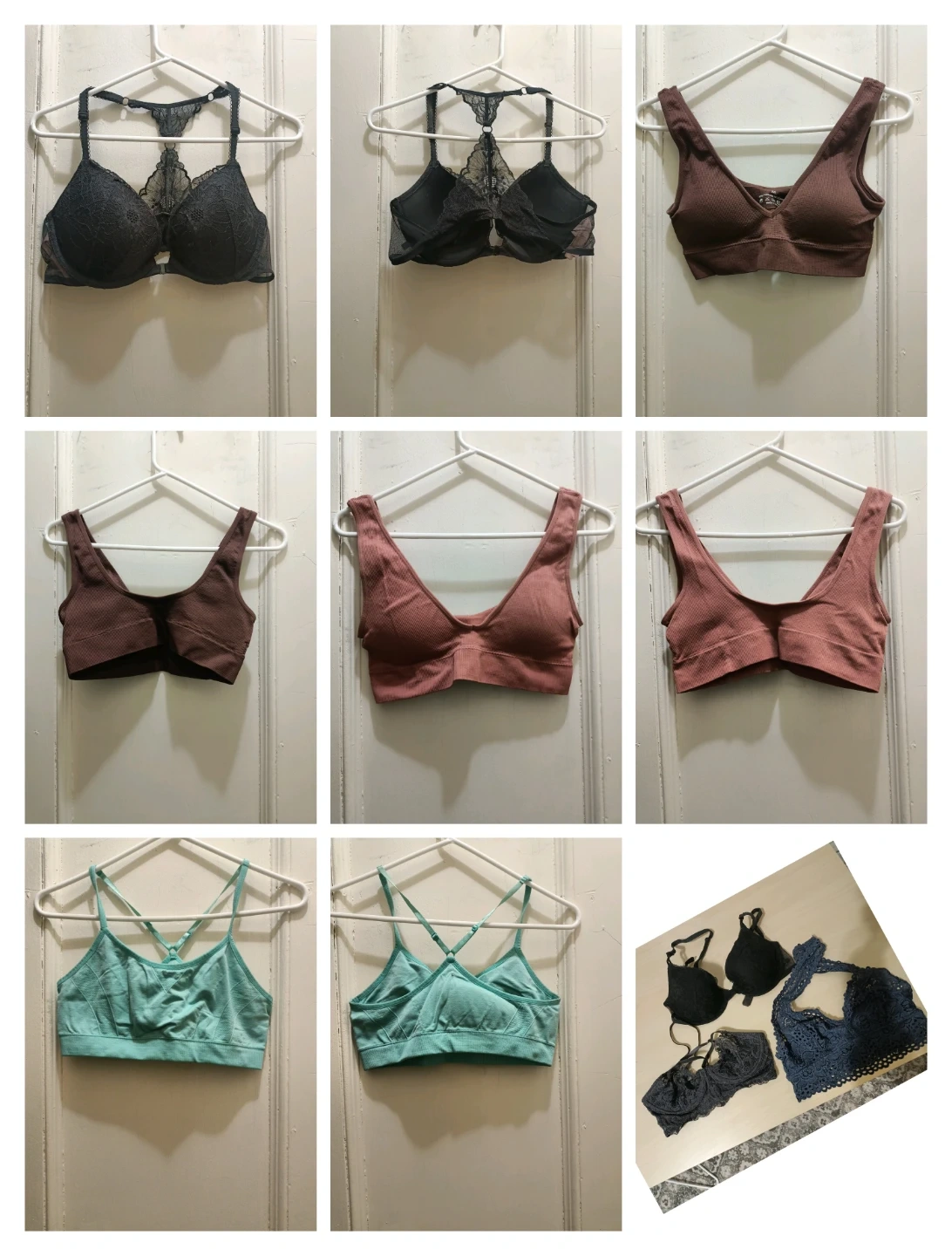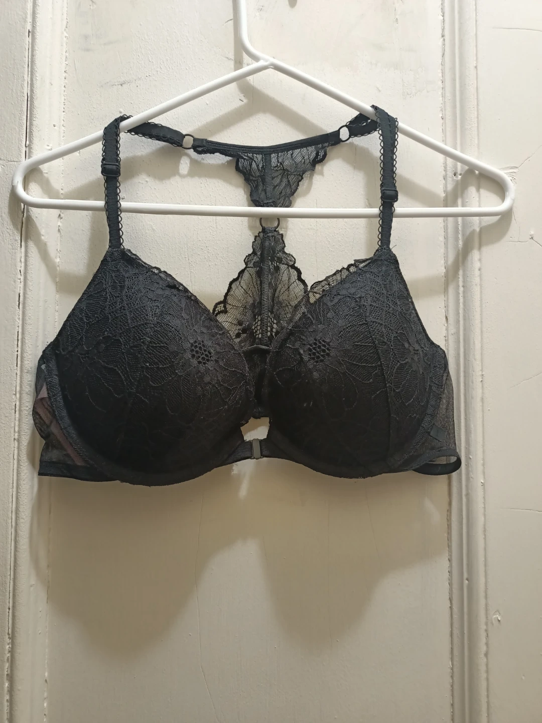 This set includes a black lace bralette with a racerback design and matching thong. The bralette features intricate floral lace detailing and adjustable straps. It's a comfortable and stylish addition to any lingerie collection! Made with a blend of nylon and spandex for a good fit.