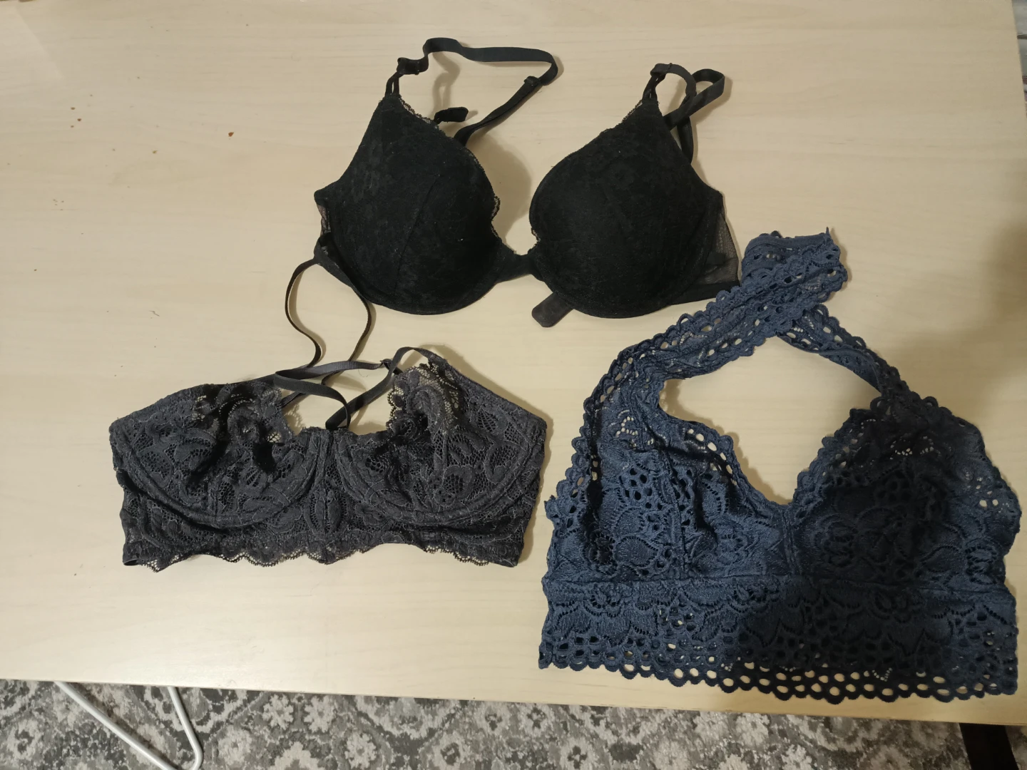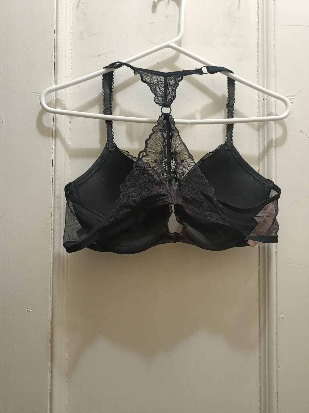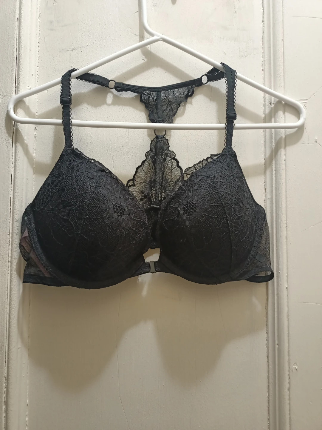 This set includes a black lace bralette with a racerback design and matching thong. The bralette features intricate floral lace detailing and adjustable straps. It's a comfortable and stylish addition to any lingerie collection! Made with a blend of nylon and spandex for a good fit.