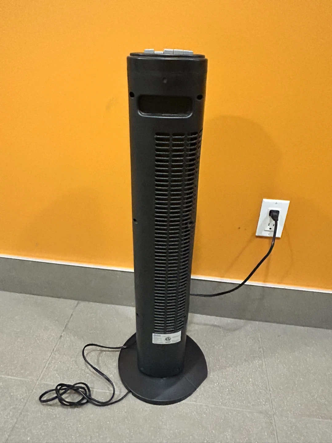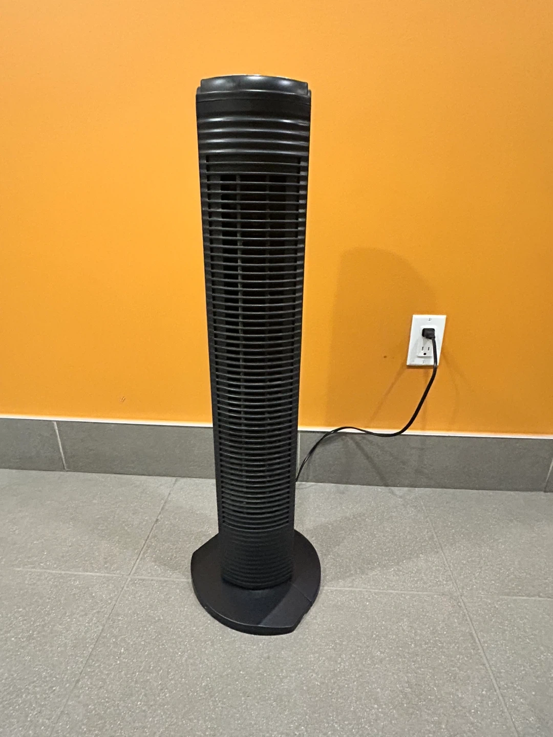 This Sunbeam tower fan is black and has three speed settings. It's a great way to keep your room cool. Plugs into a standard wall outlet.