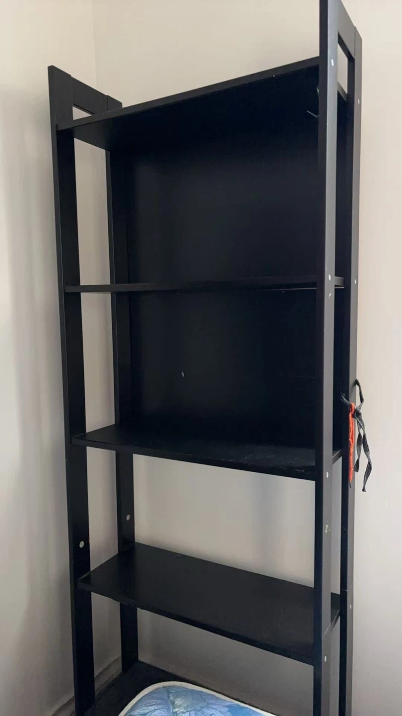 This is a black, four-shelf bookshelf. It's made of wood and has an open design. Useful for storing books and display items.