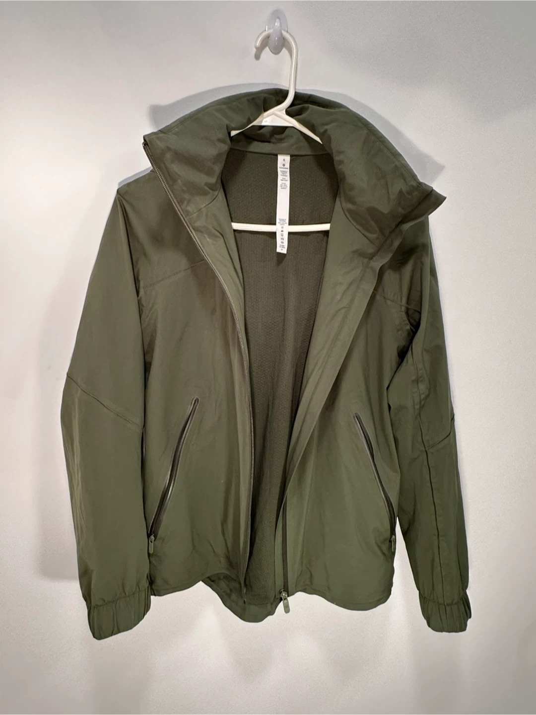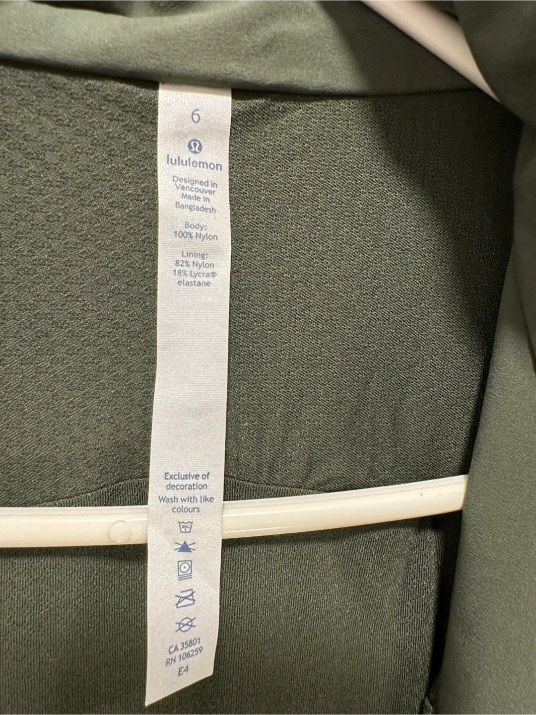 This Lululemon jacket is a size 6 and features a hood. It's made from 100% nylon for the body and 82% nylon with 18% Lycra elastane for the liner. Designed in Vancouver, it's made in Bangladesh. It's perfect for layering on cooler days!