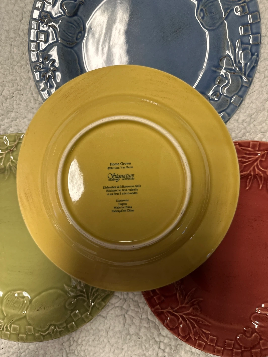 This set includes four 8 1/4 inch plates from Everware's Home Grown collection. They're made of stoneware and are dishwasher and microwave safe. Plates are in assorted colours.