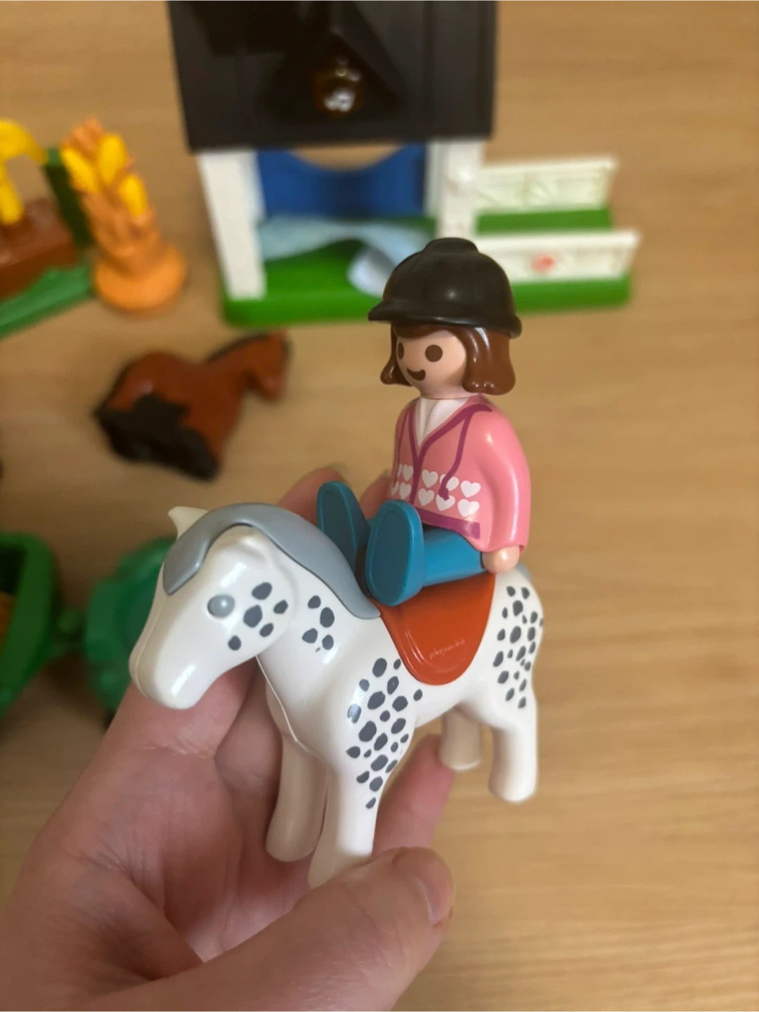 This Little People farm set includes a red barn, a stable (light and sound effects), a tractor with a trailer, and various animal figures like a horse, cow, chicken, and a farmer. It also comes with fencing and corn stalks and Playmobile figures of horse and girl. This playset offers hours of imaginative fun for little ones on the farm! Great condition.