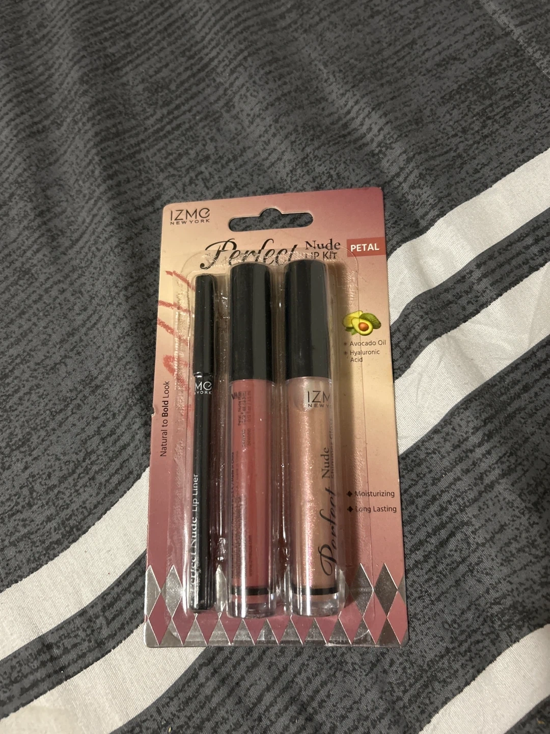 Selling IZME New York Perfect Nude Lip Kit in the shade Petal! This set includes a lip liner and two lip glosses. It's designed to give you a natural to bold look, and the formula includes avocado oil and hyaluronic acid for moisturizing and long-lasting wear.