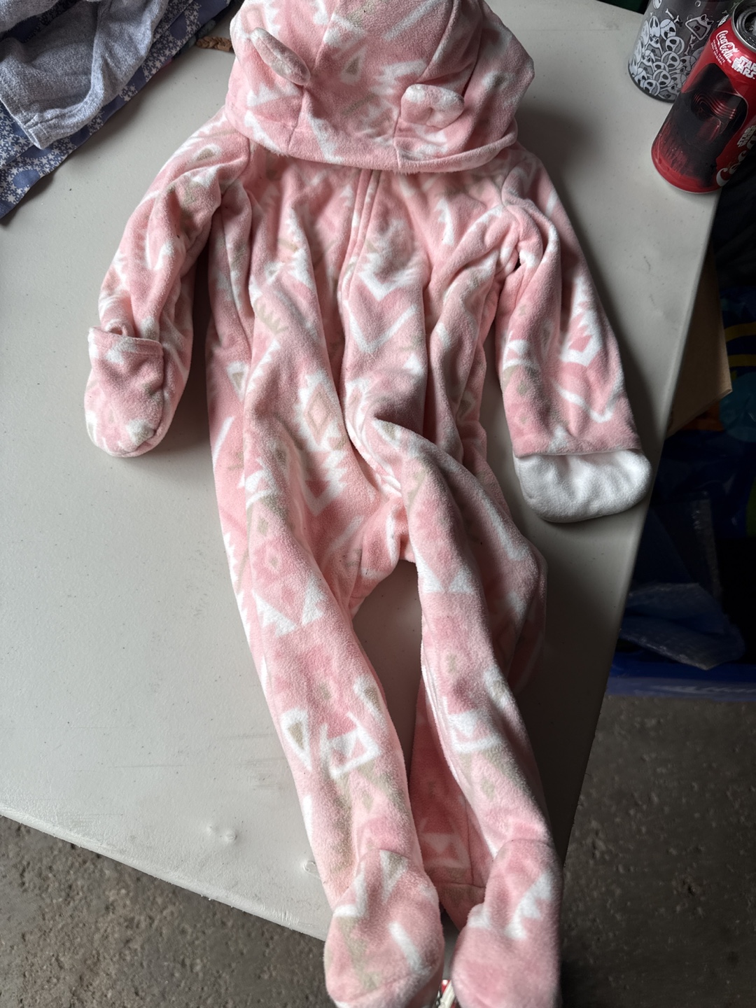 A cozy and adorable pink fleece onesie, perfect for keeping your little one warm! It features a cute bear hood and a soft, comfortable material. Great for playtime or naptime!