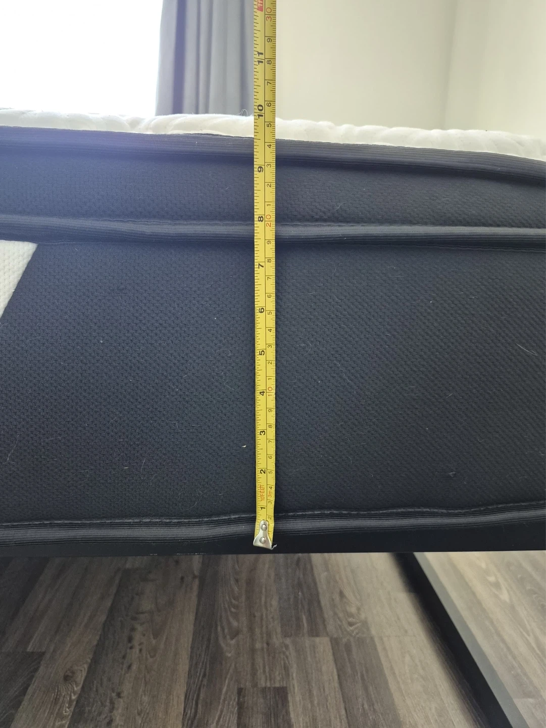 Sturdy black metal bed frame. Includes a mattress with a quilted top. Mattress is approximately 10 inches thick.