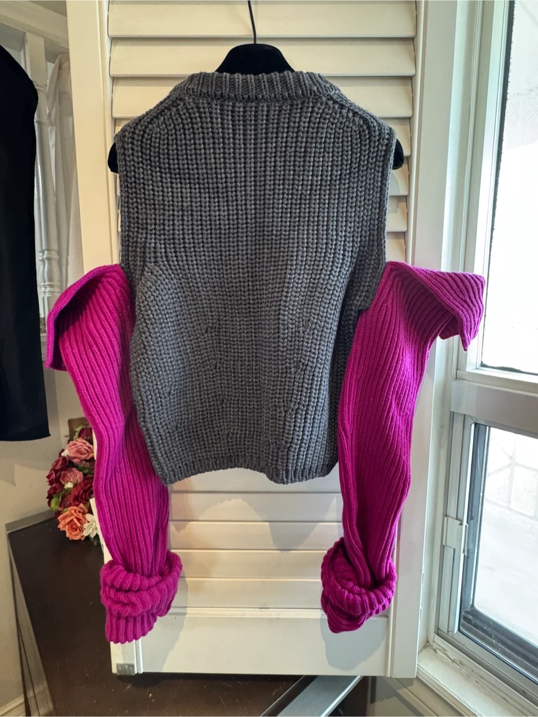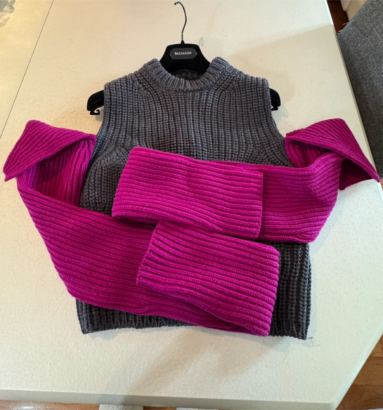 Selling a unique Calvin Klein knit vest! It features a stylish grey knit body and eye-catching detachable pink sleeves. Perfect for adding a pop of colour to your wardrobe and staying cozy.