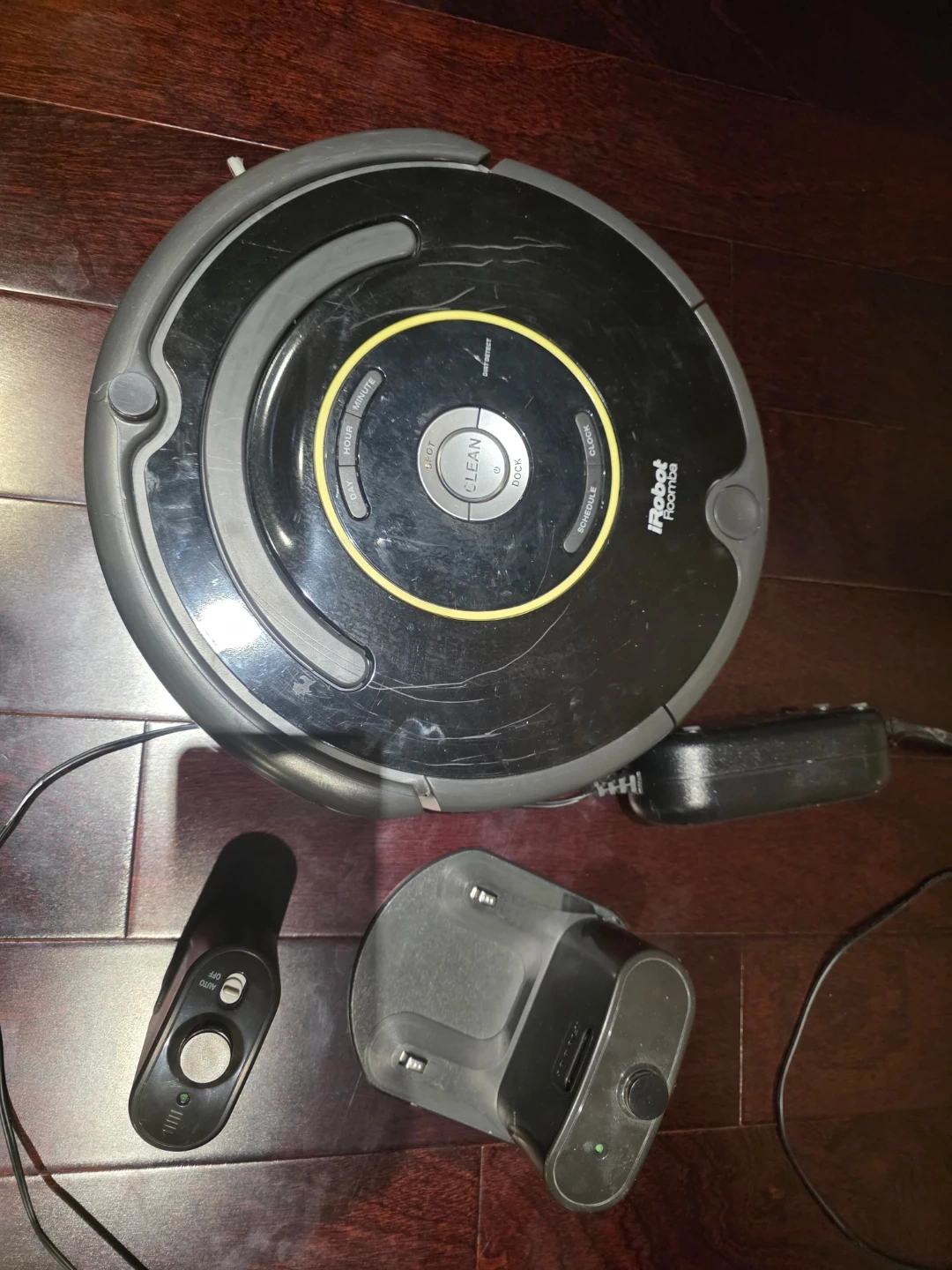 This iRobot Roomba is a robotic vacuum cleaner. It comes with a charging dock and an electric fence . The vacuum has a clean button and can be scheduled for cleaning cycles.
