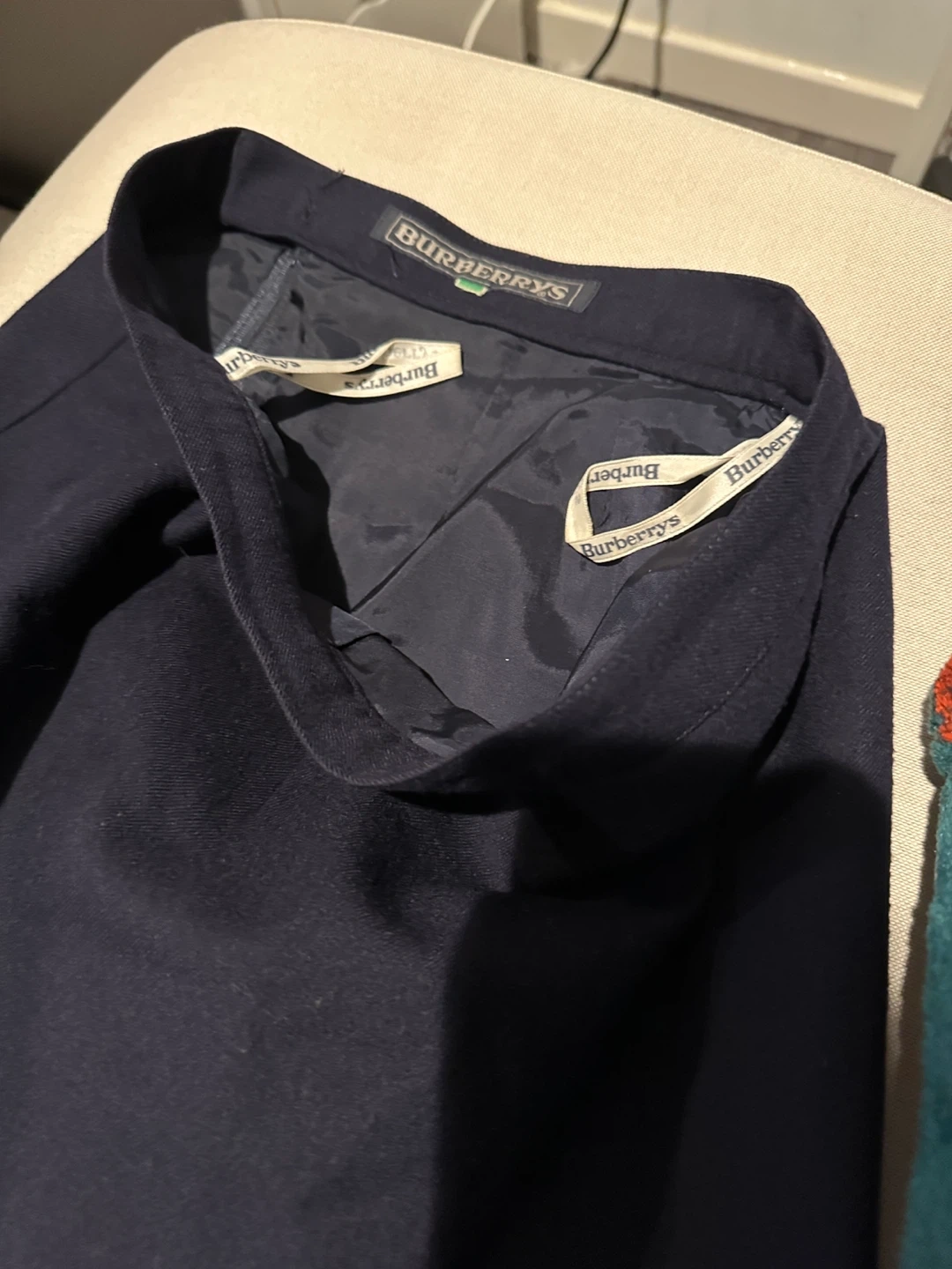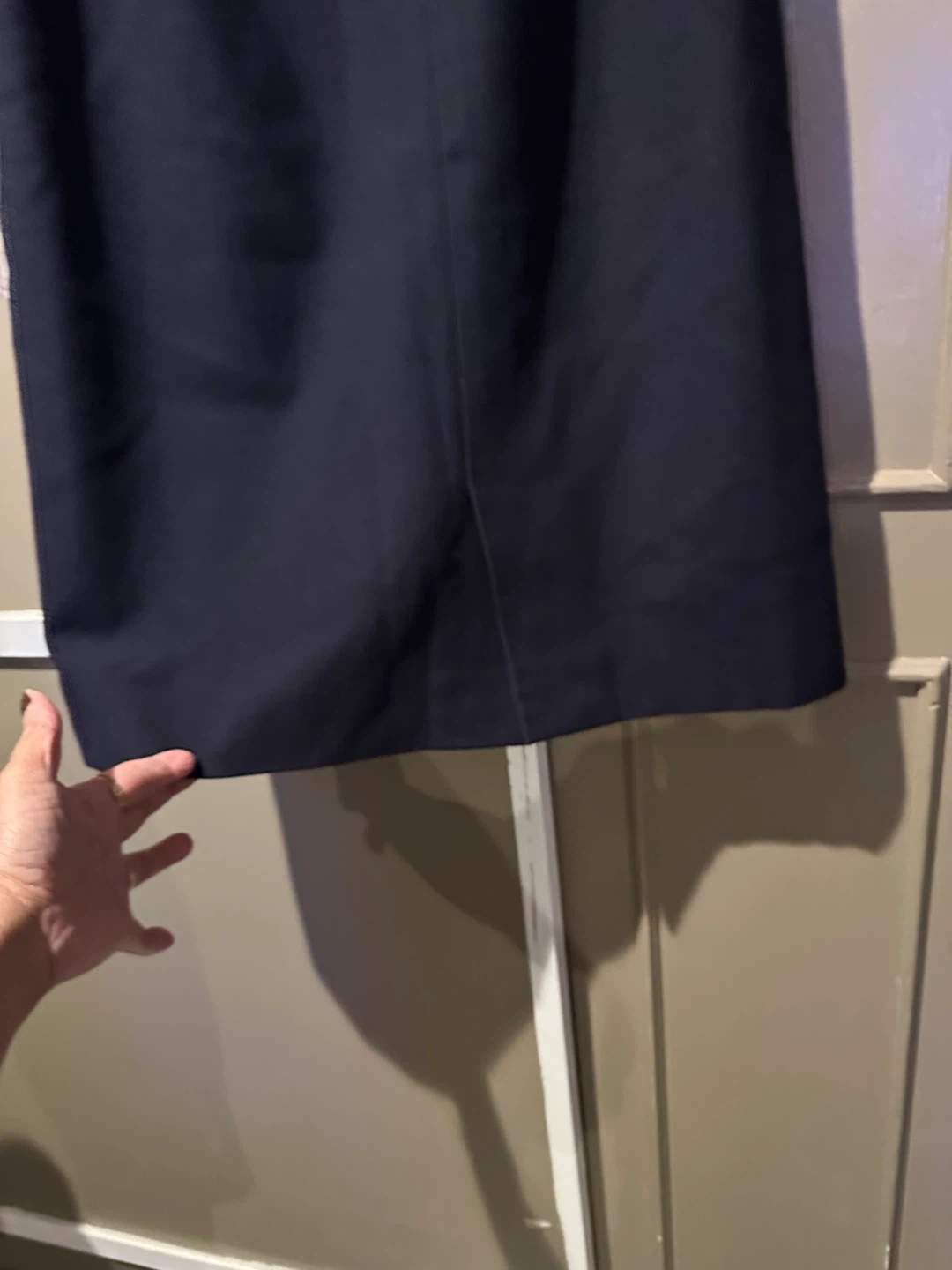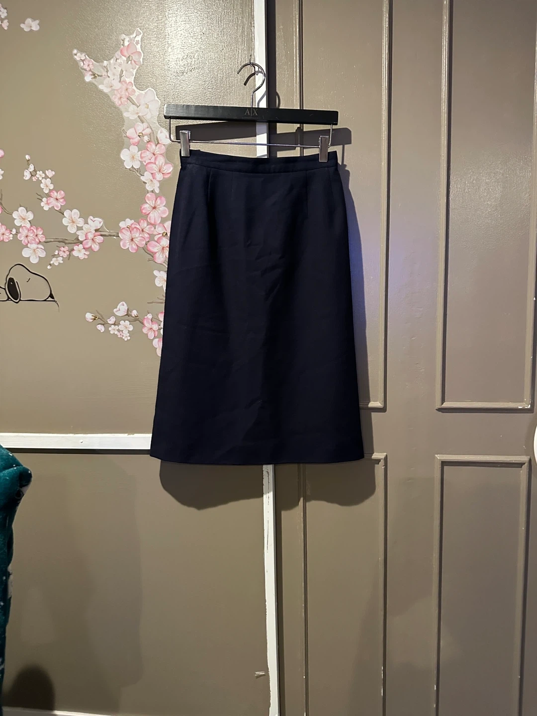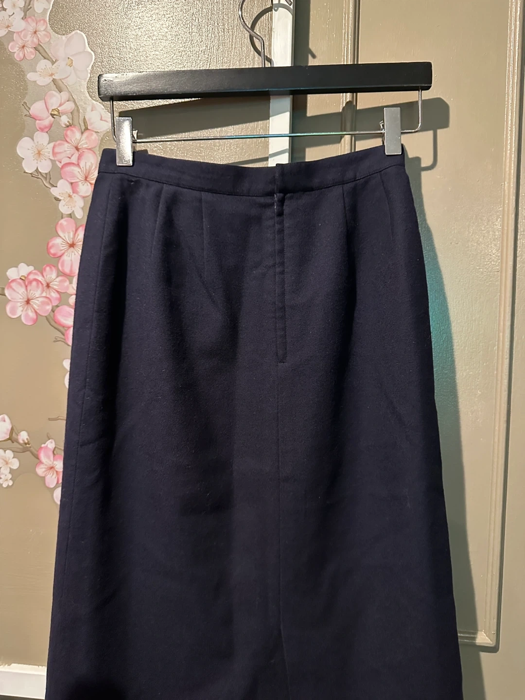Classic Burberrys navy wool skirt. It's a knee-length A-line style with a back zip closure. This skirt is made from quality wool fabric.
