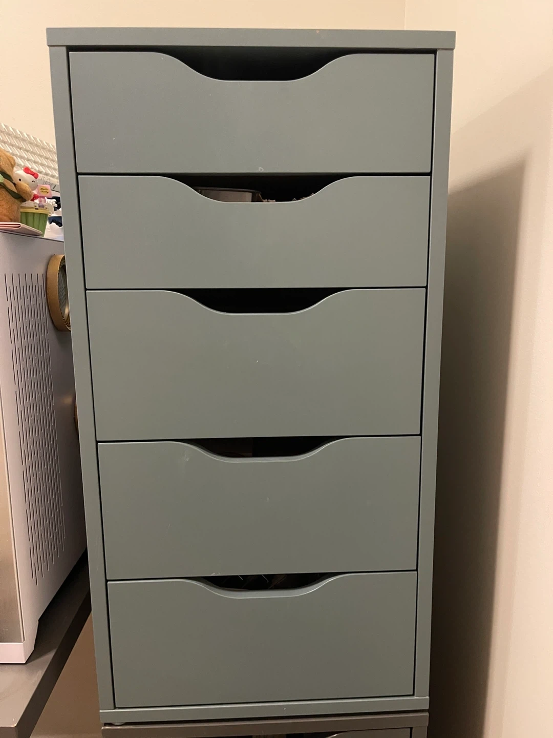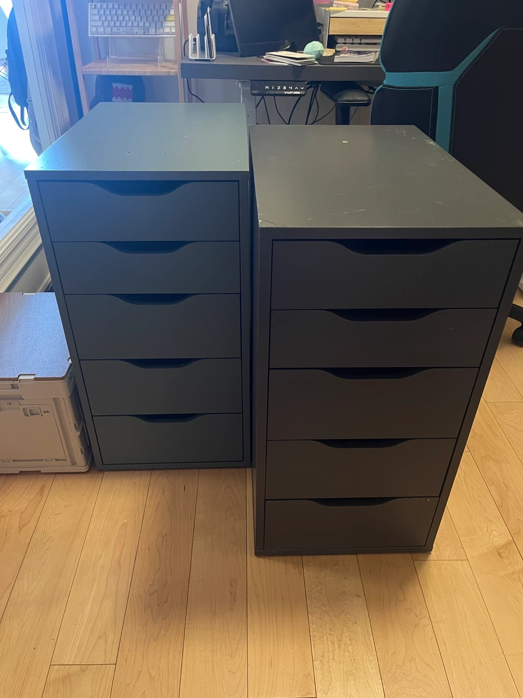 Selling both used IKEA Alex 5 drawer unit in grey + grey-turquoise. Has some few scuffs on top from wear and tear. Grey-turquoise has some hole you can screw to a desk.