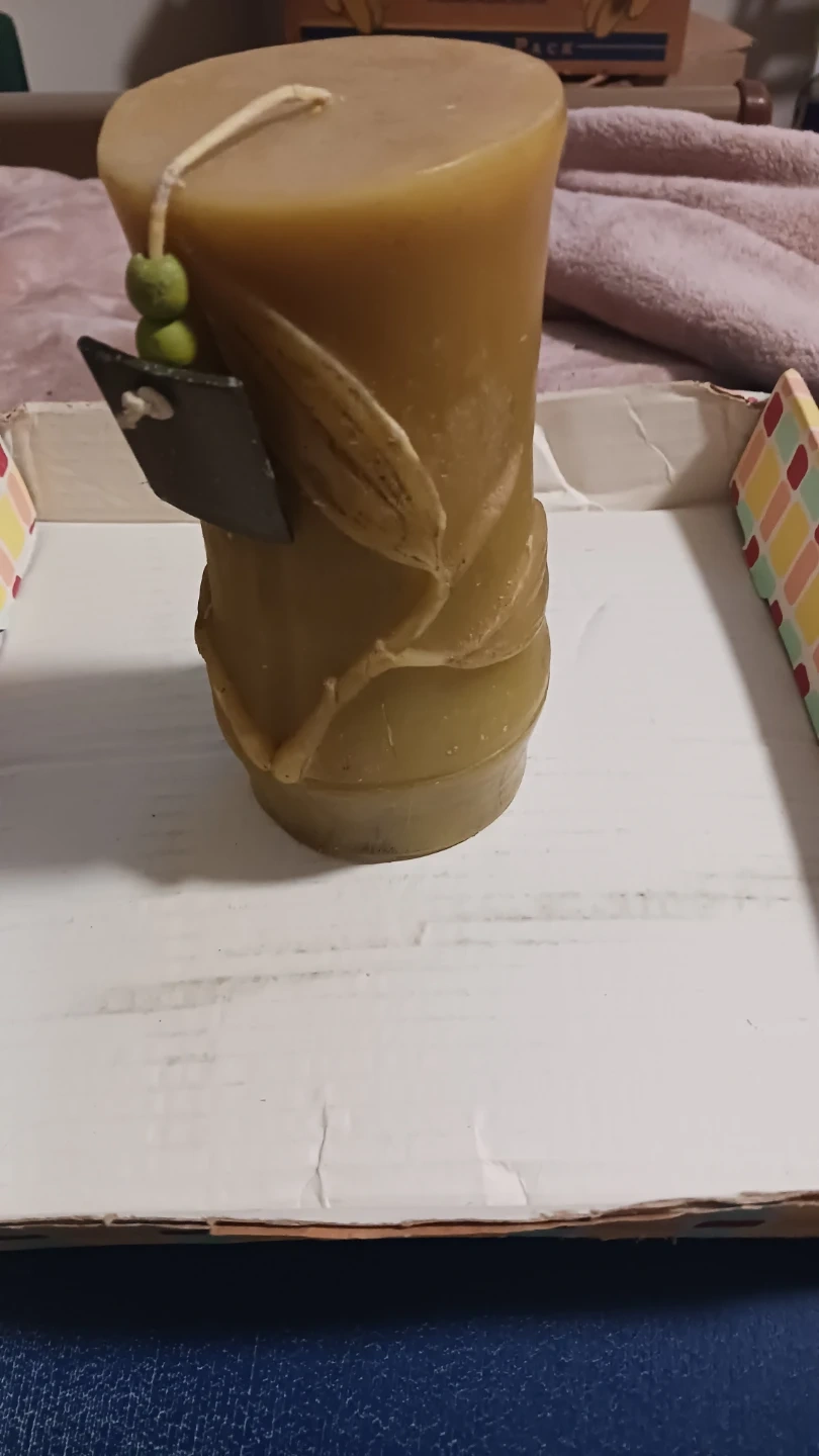 This is a decorative pillar candle with a carved leaf design. It's a green colour and has a rustic charm. It includes a tag with beads attached. It's nice for home decor!