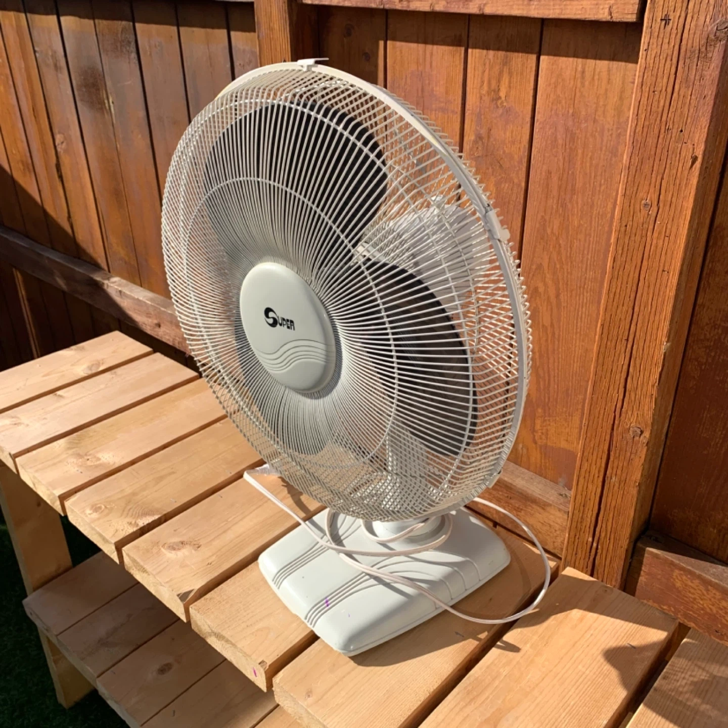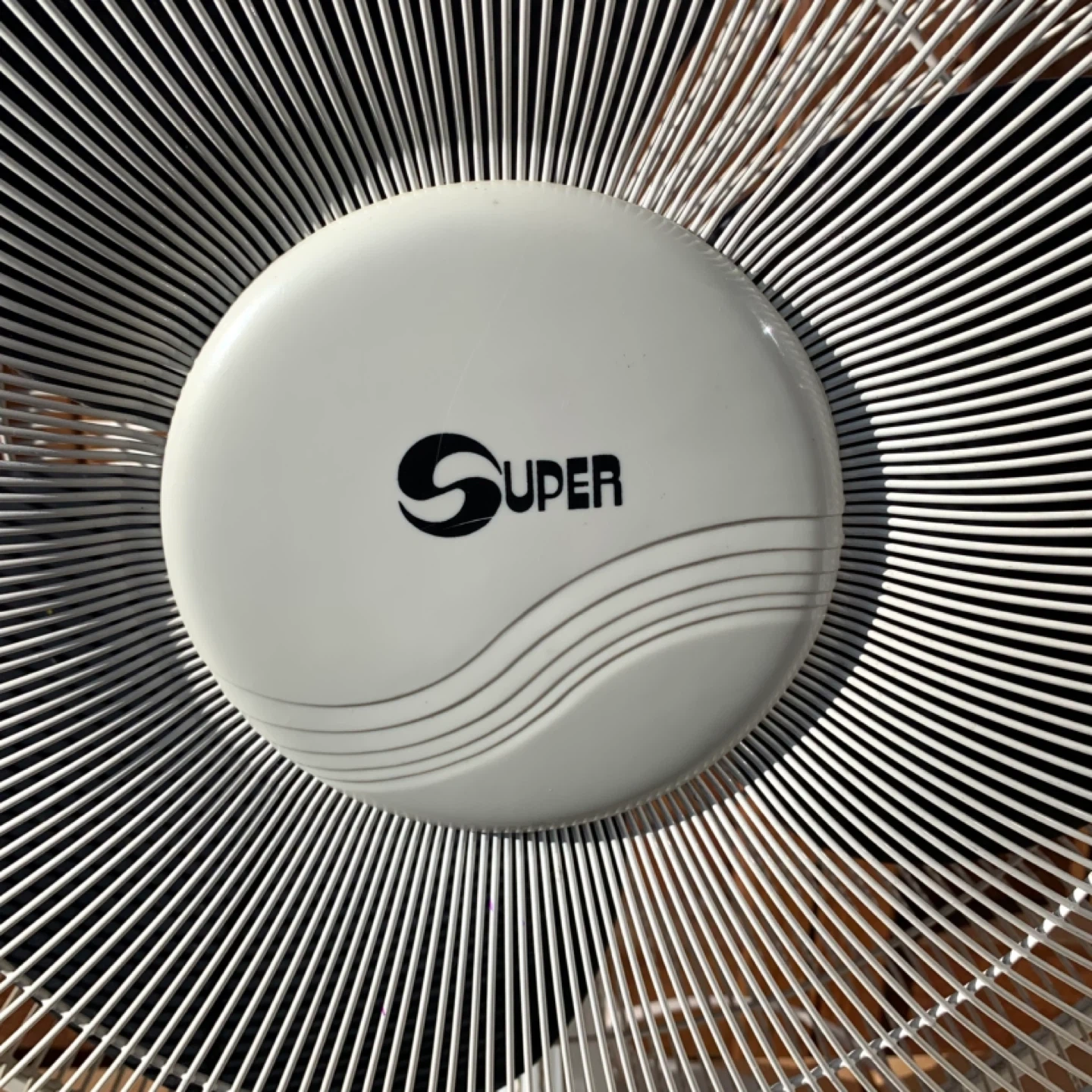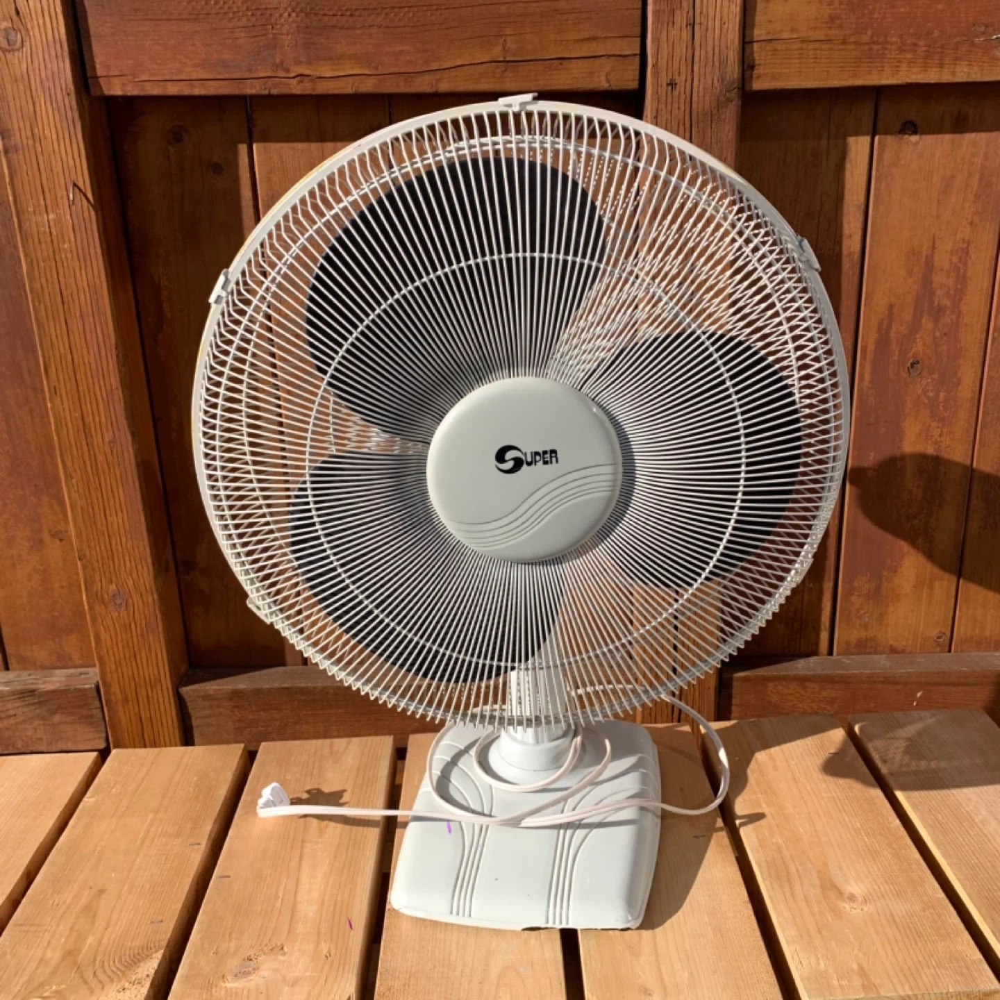 Desk fan tabletop fan white SUPER brand perfect for cooling small spaces like desks, bedrooms, or offices. Adjustable speed settings provide good airflow while compact design makes it easy to place anywhere. Note: fan works well but oscillating feature is not working, stays fixed in position and can be angled manually.