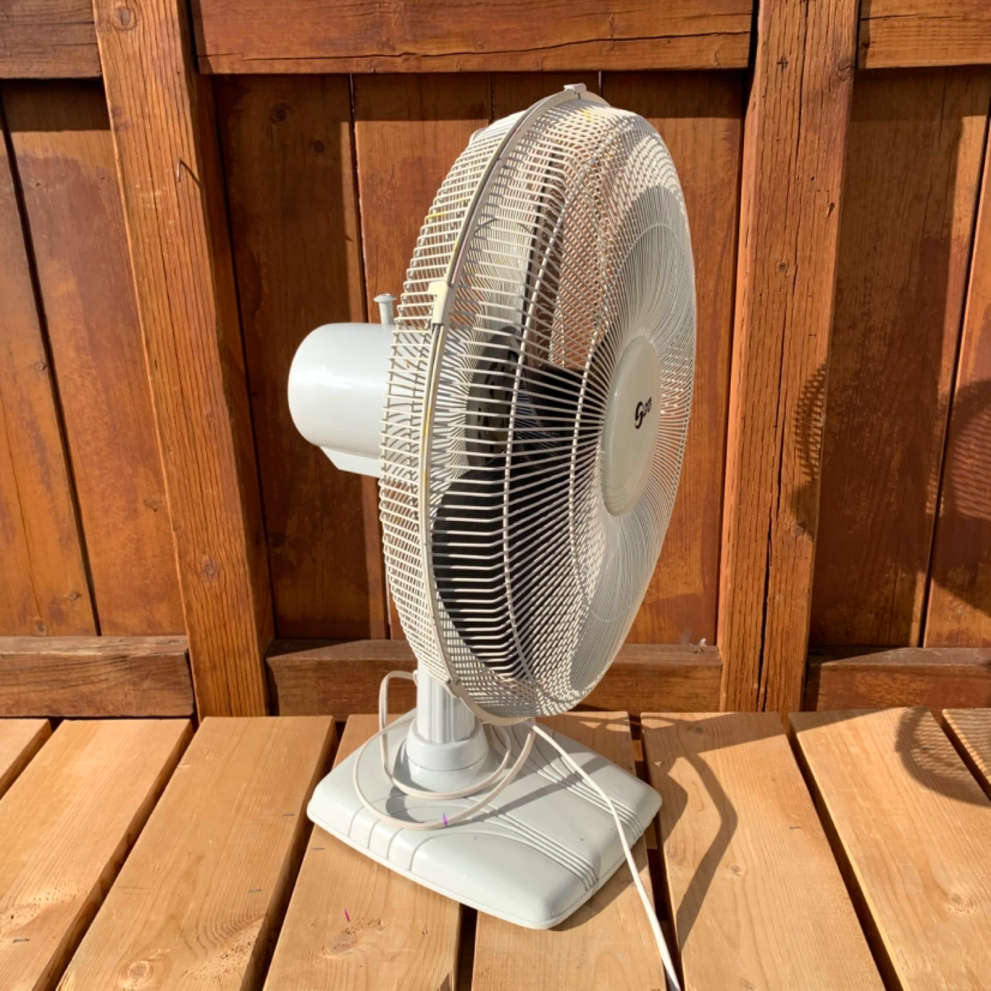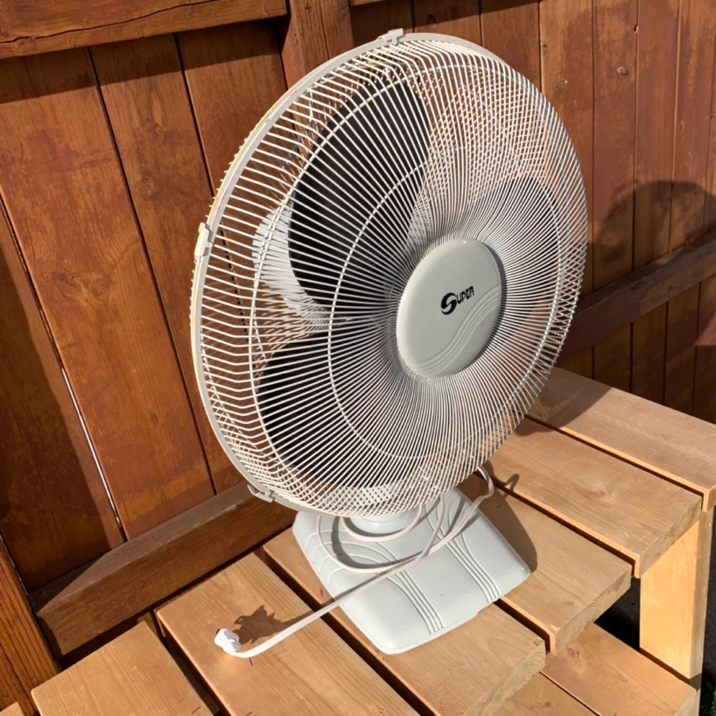 Desk fan tabletop fan white SUPER brand perfect for cooling small spaces like desks, bedrooms, or offices. Adjustable speed settings provide good airflow while compact design makes it easy to place anywhere. Note: fan works well but oscillating feature is not working, stays fixed in position and can be angled manually.