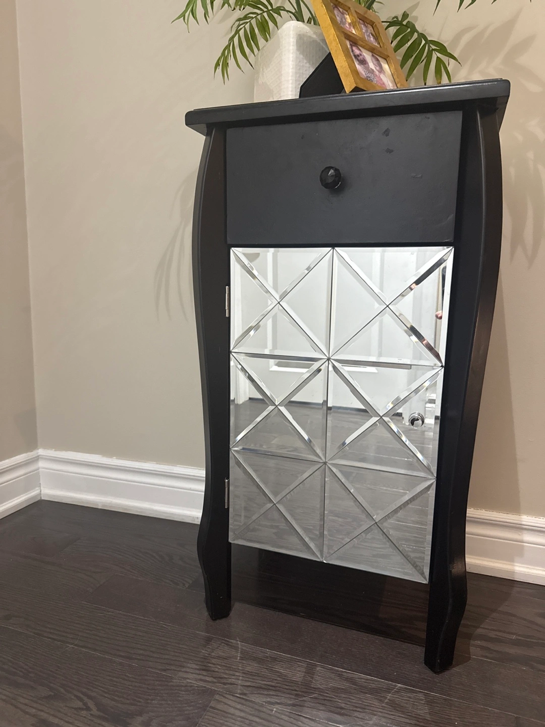 This black accent cabinet features a mirrored door with a diamond-shaped geometric pattern. It has one drawer and a cabinet space for storage. The curved legs add an elegant touch.