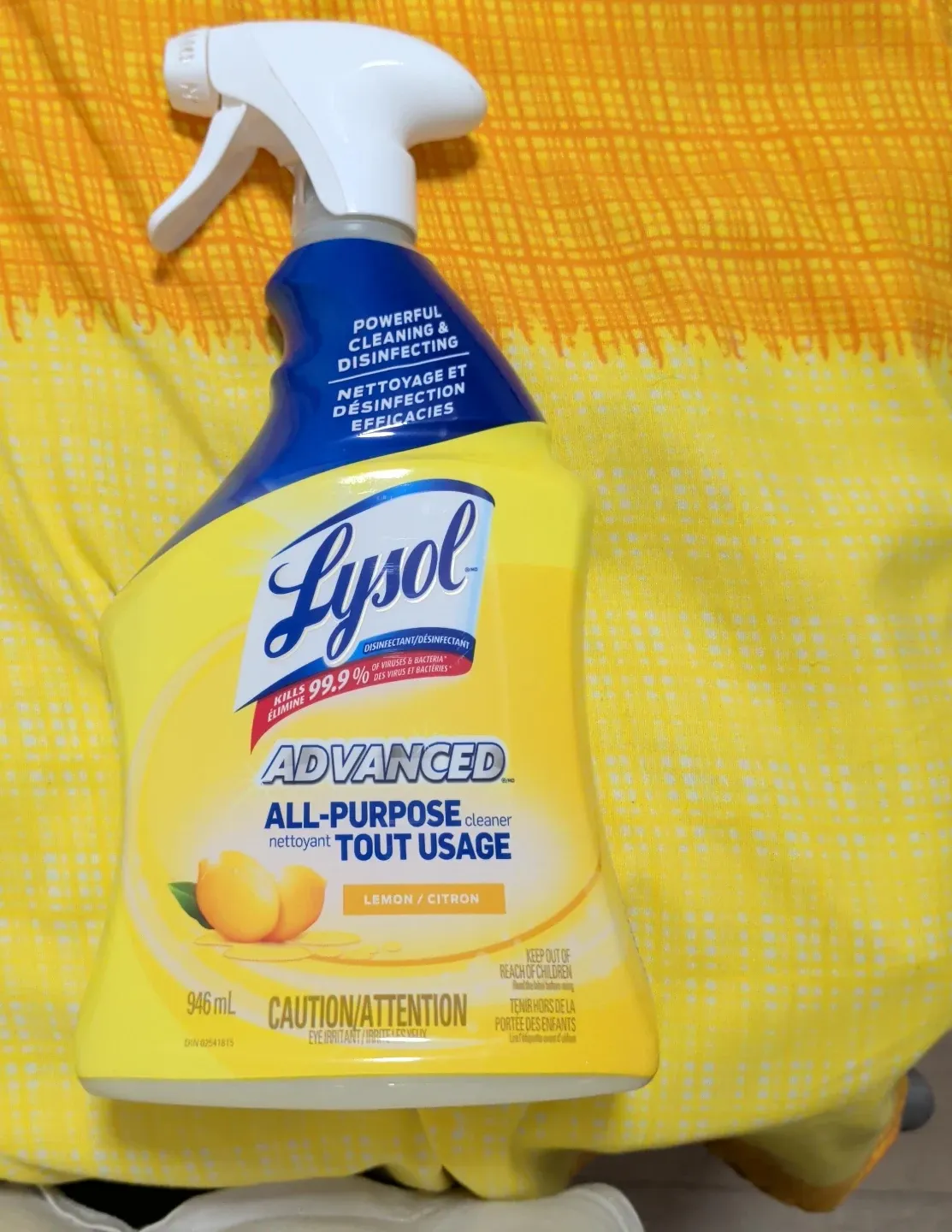 This Lysol Advanced All-Purpose cleaner comes in a lemon scent. It's designed for powerful cleaning and disinfecting, killing 99.9% of viruses and bacteria. The bottle contains 946 mL.