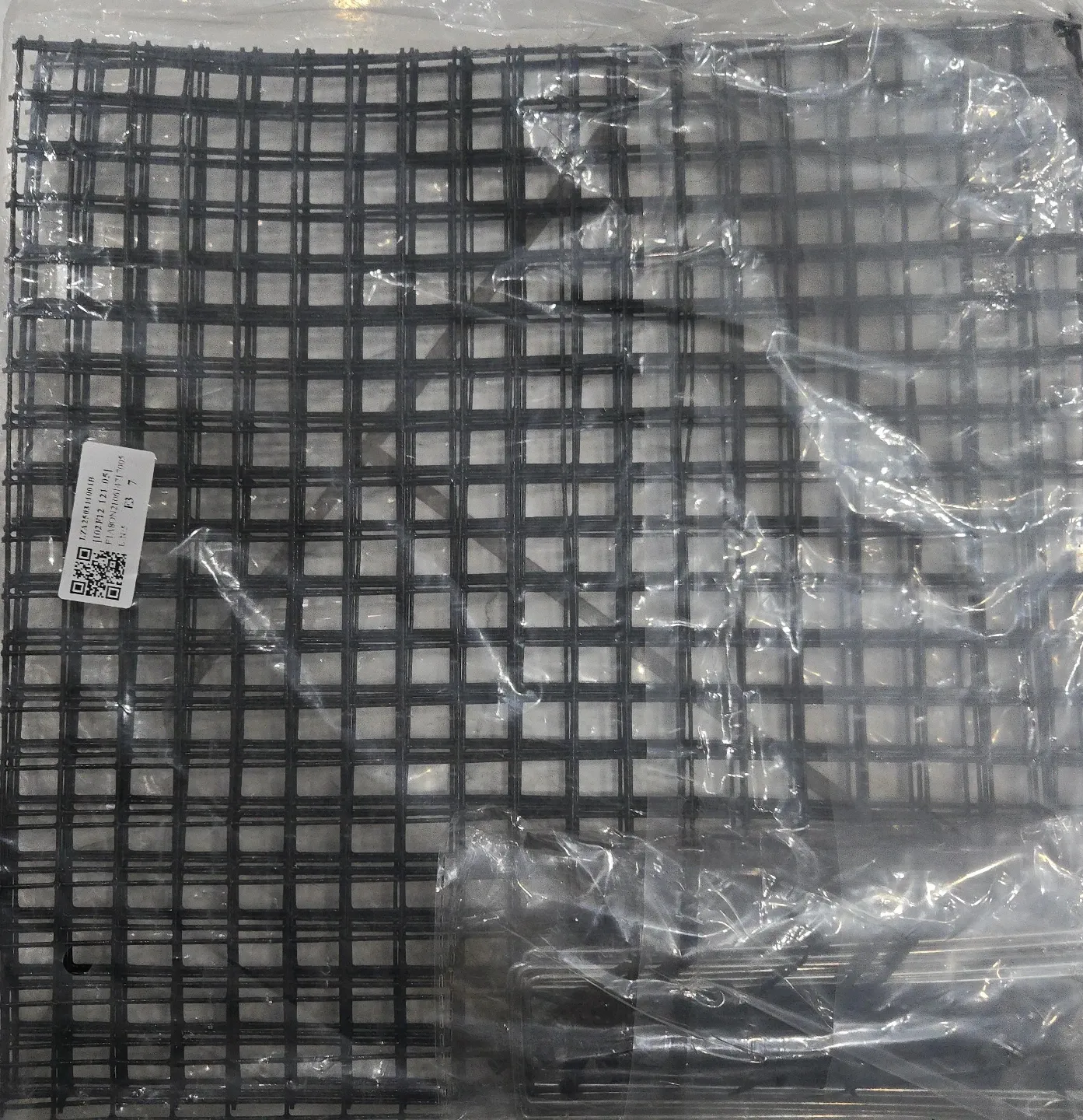 This is a black wire mesh panel. It's made of plastic. The grid size is small, suitable for crafts or small enclosures. It comes sealed in its original packaging.