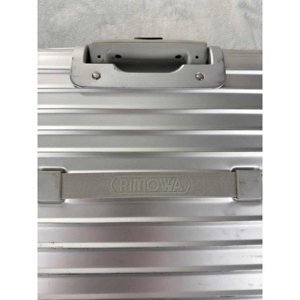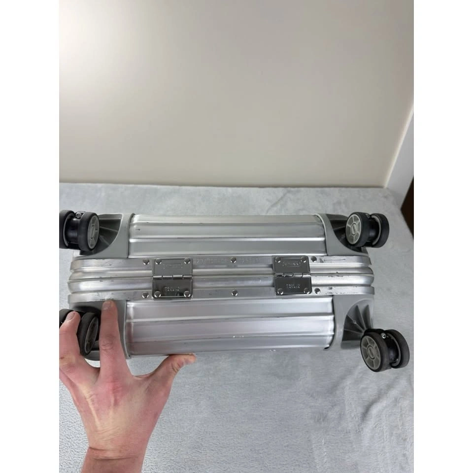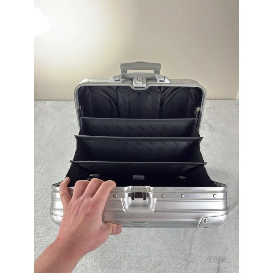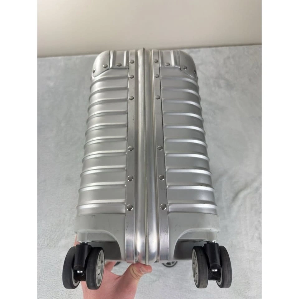 Rimowa Topas Aluminum Business Wheels Carry On in good pre-owned condition, as shown in the photos. Normal wear and tear is visible around the carry-on. Includes original manual and product details. Style number: topas business carry on. 100% aluminum. Made in Canada. Silver color. Measurements: 13" height, 16" width, 25.5" carry-on handle. See pictures for reference.