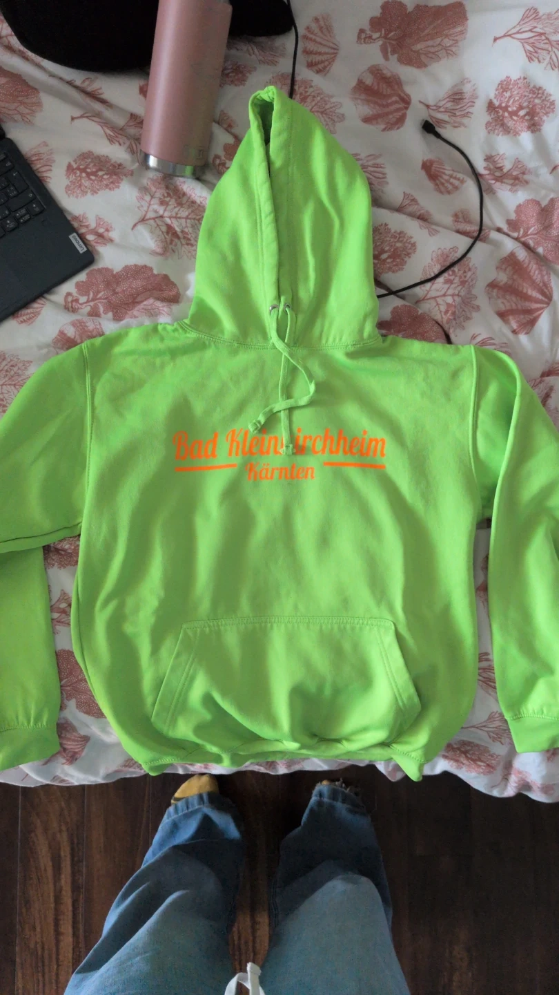 A bright lime green hoodie with orange text that says "Bad Kleinkirchheim Kärnten". The tag has worn off but I'd say the size is about an oversized small - medium. It's also in perfect condition.