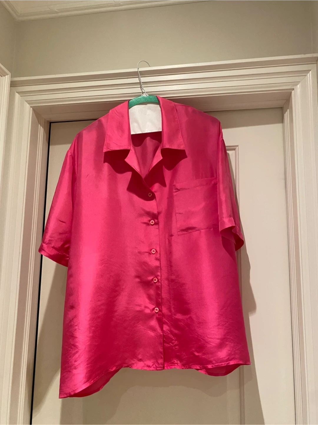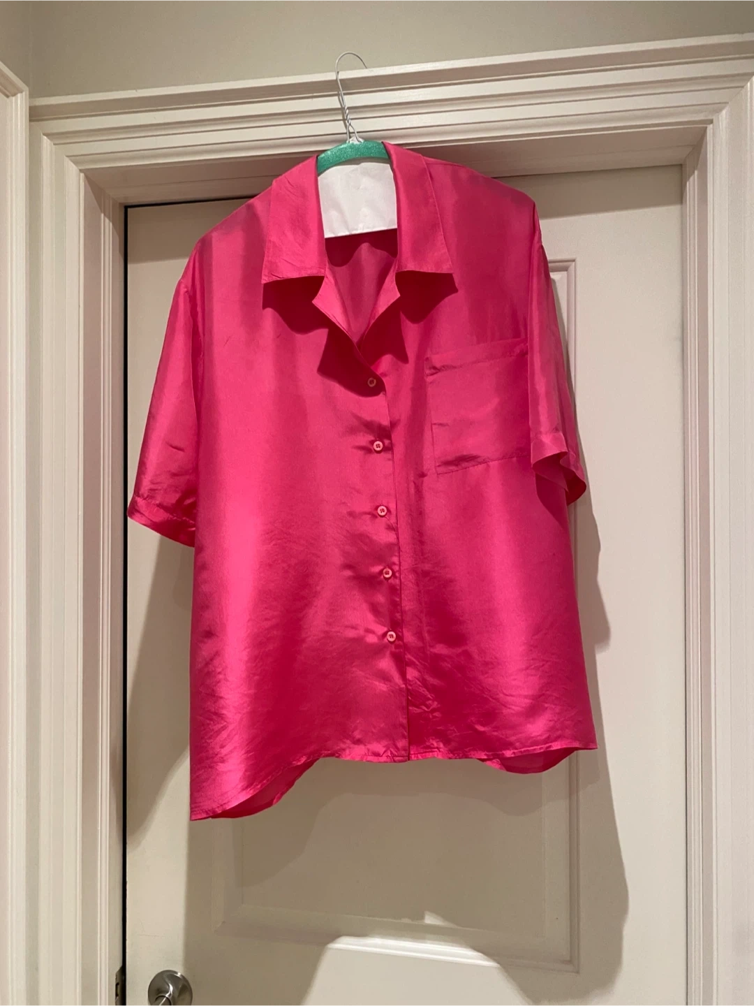 This is a 100% silk pink button-up blouse with short sleeves and a chest pocket. It's a loose-fitting style.