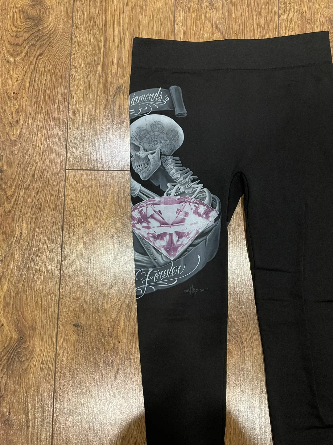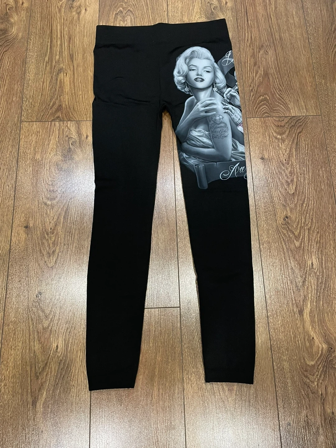 These black leggings from Holy Angels feature a unique Marilyn Monroe and skeleton design. They are a one-size-fits-all item and are made from 95% polyester and 5% spandex. The leggings are in great condition and ready for a new home!