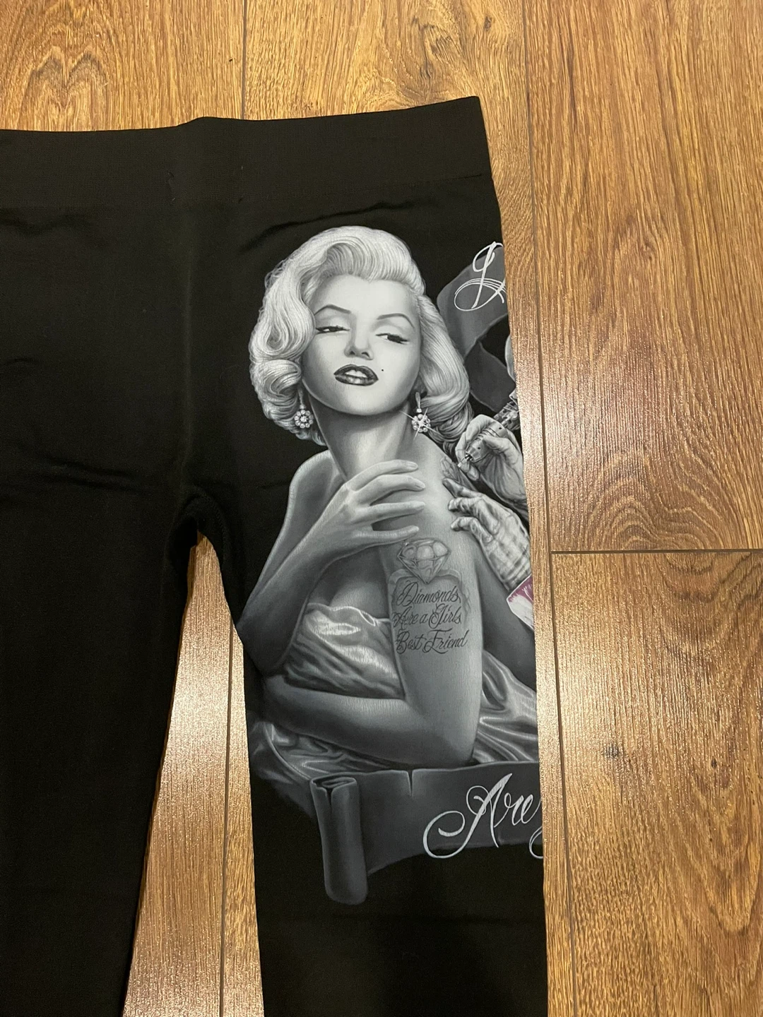 These black leggings from Holy Angels feature a unique Marilyn Monroe and skeleton design. They are a one-size-fits-all item and are made from 95% polyester and 5% spandex. The leggings are in great condition and ready for a new home!