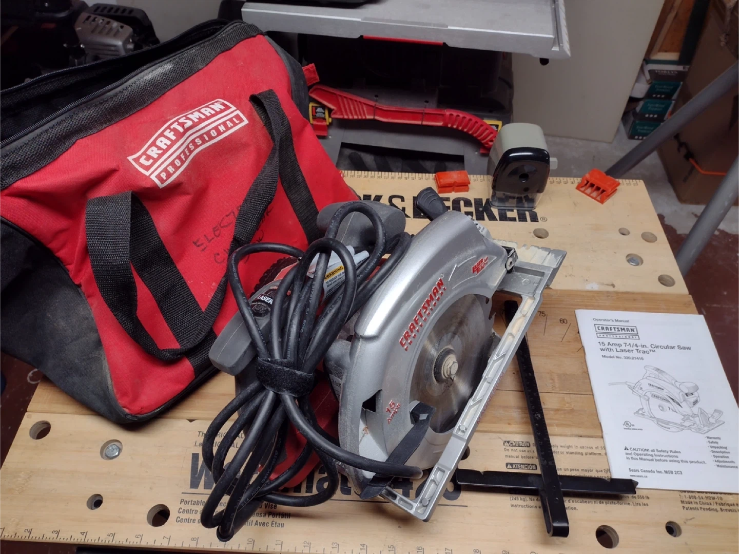 This Craftsman circular saw is a corded electric model with a 15 amp motor. It features a Laser Trac guide for precise cuts. Includes the saw, a red Craftsman carrying bag, and an instruction manual.