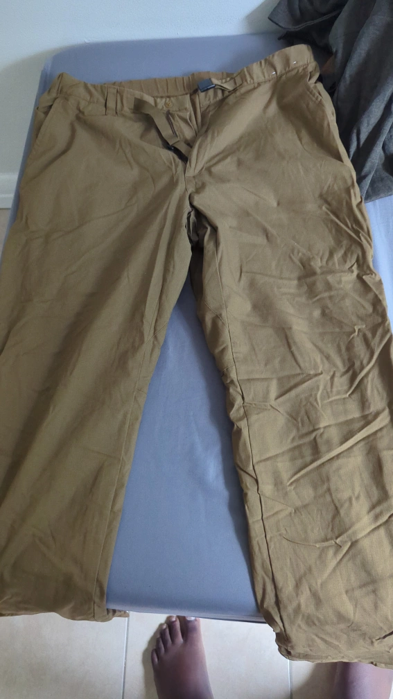 Uniqlo Heattech pants, size L/G with a waist of 33-36 inches. The shell is made of 66% polyester and 34% spandex. The lining is 62% polyester, 22% acrylic, and 16% rayon. Good for fall and winter weather