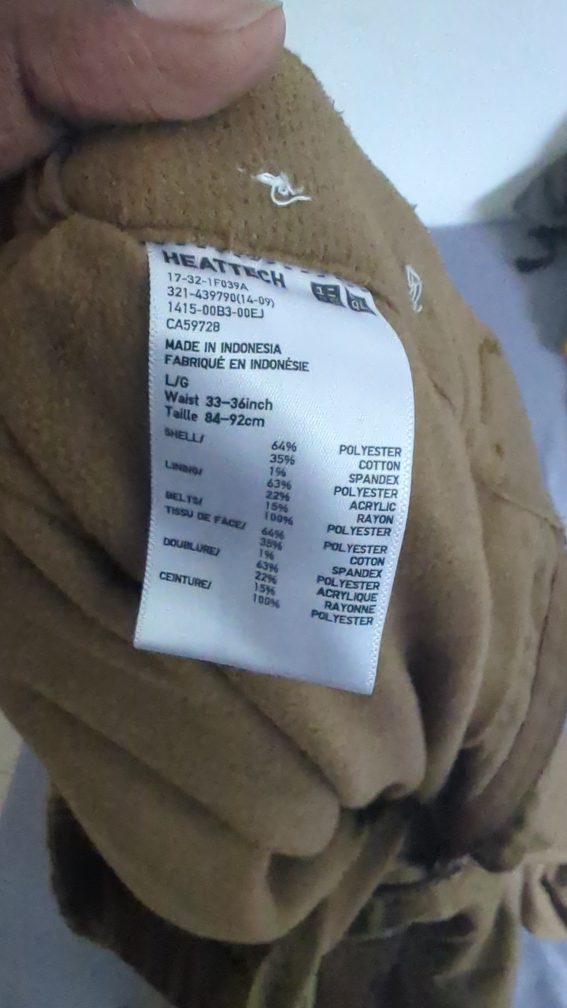 Uniqlo Heattech pants, size L/G with a waist of 33-36 inches. The shell is made of 66% polyester and 34% spandex. The lining is 62% polyester, 22% acrylic, and 16% rayon. Good for fall and winter weather