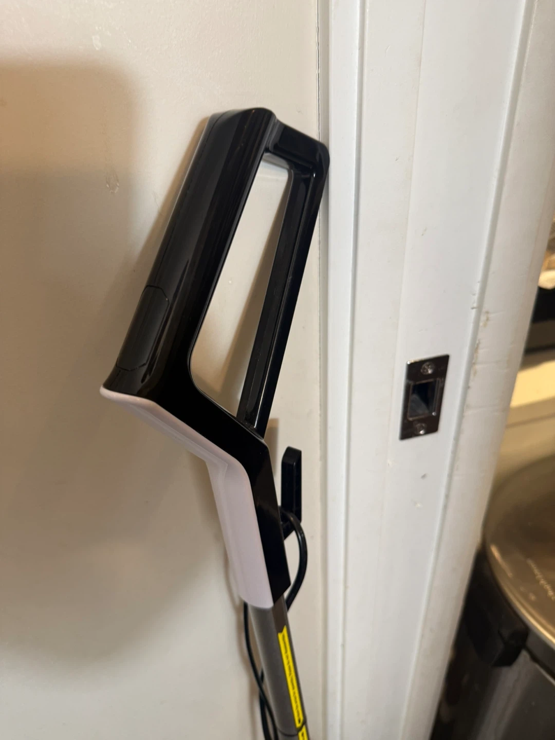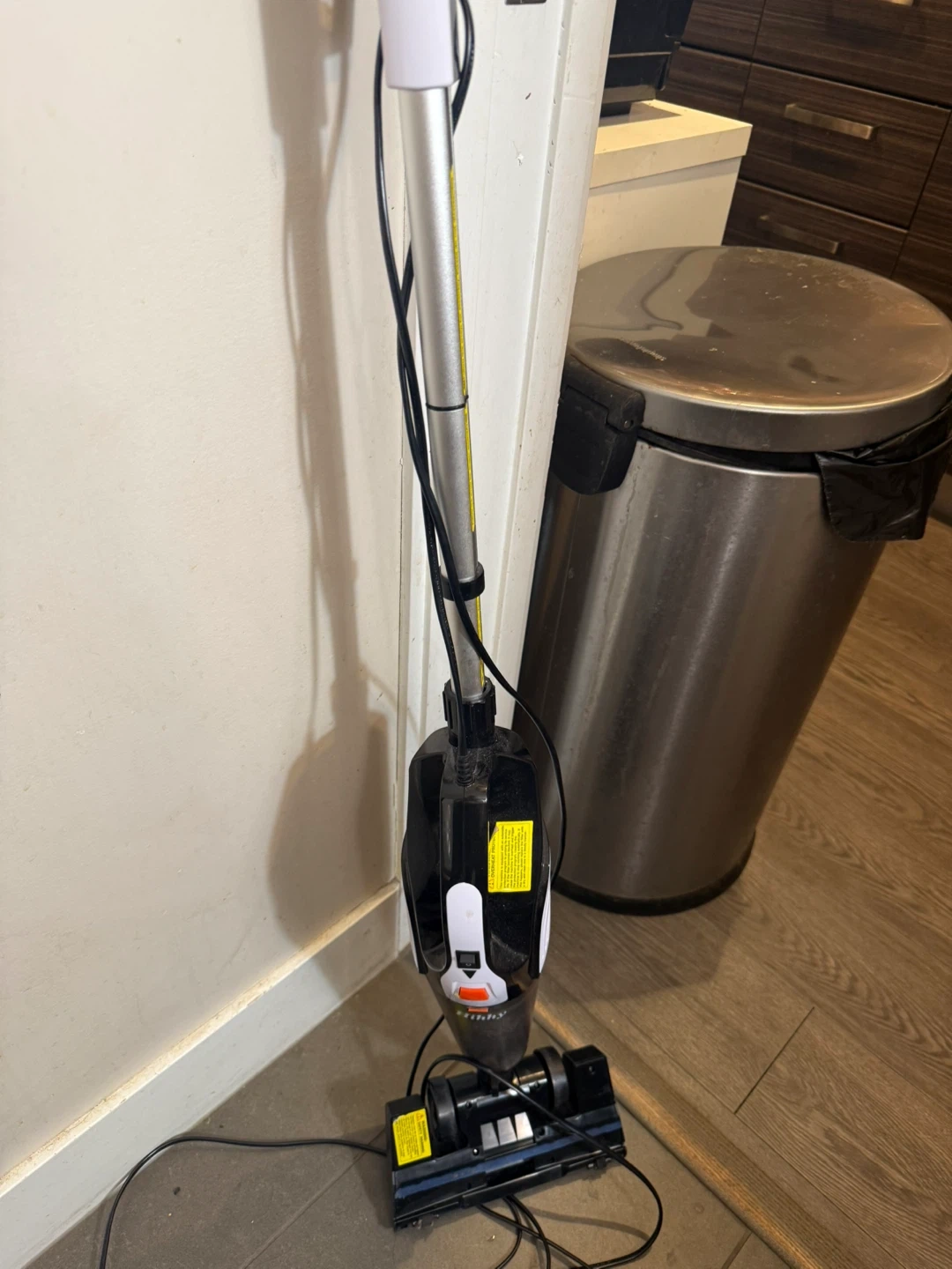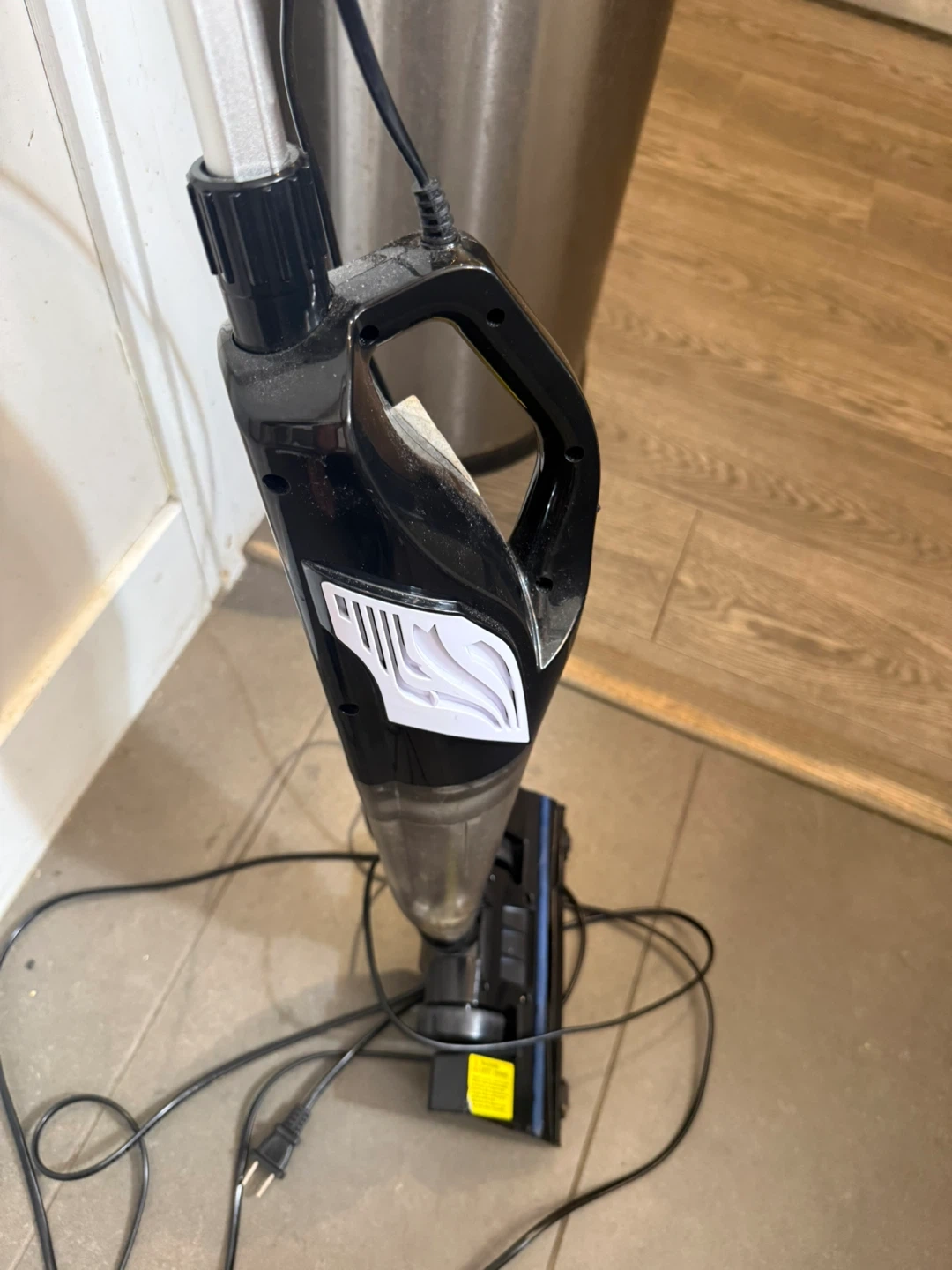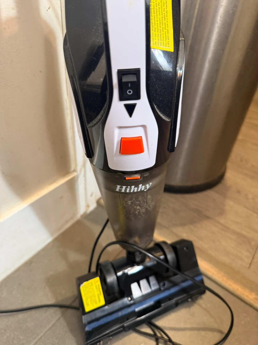 This is a Hihhy stick vacuum cleaner. It's black and white with a clear dustbin. Comes with the main unit and brush head. Easy to use for quick cleanups!