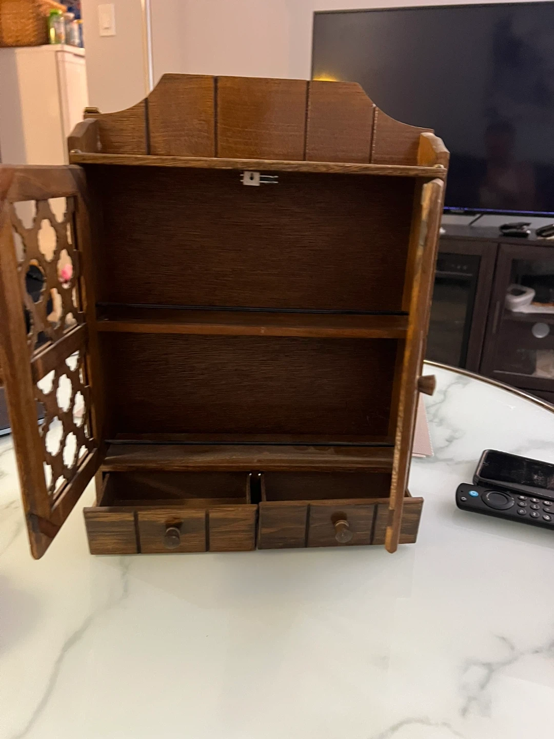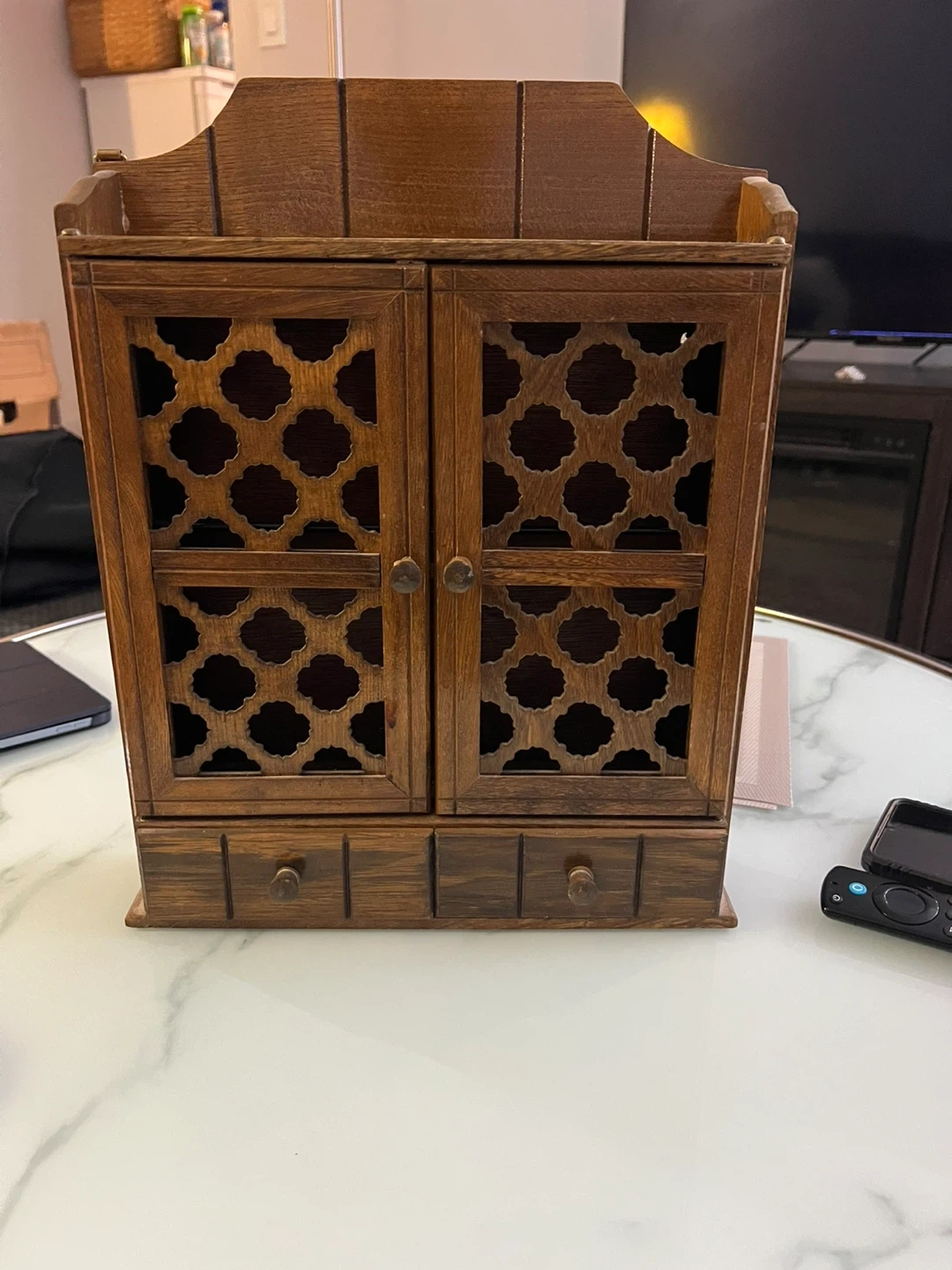 A lovely used vintage wooden cabinet with two doors and two drawers. It features a decorative lattice design on the doors. Perfect for storing small items or displaying trinkets. Made of wood.
