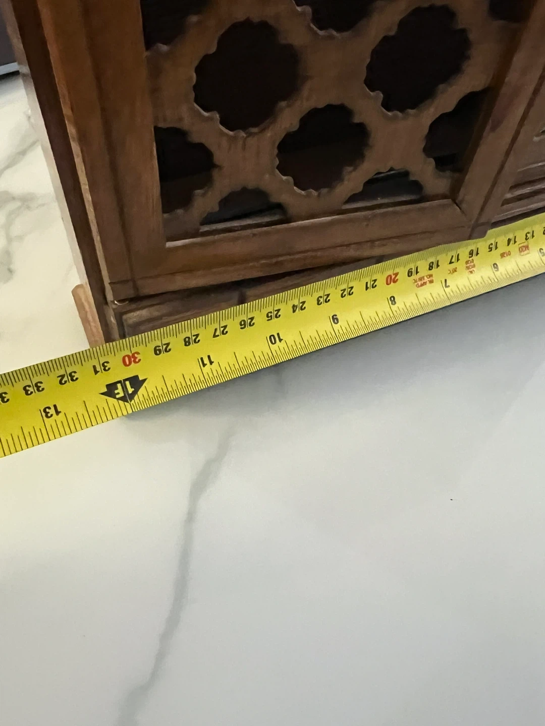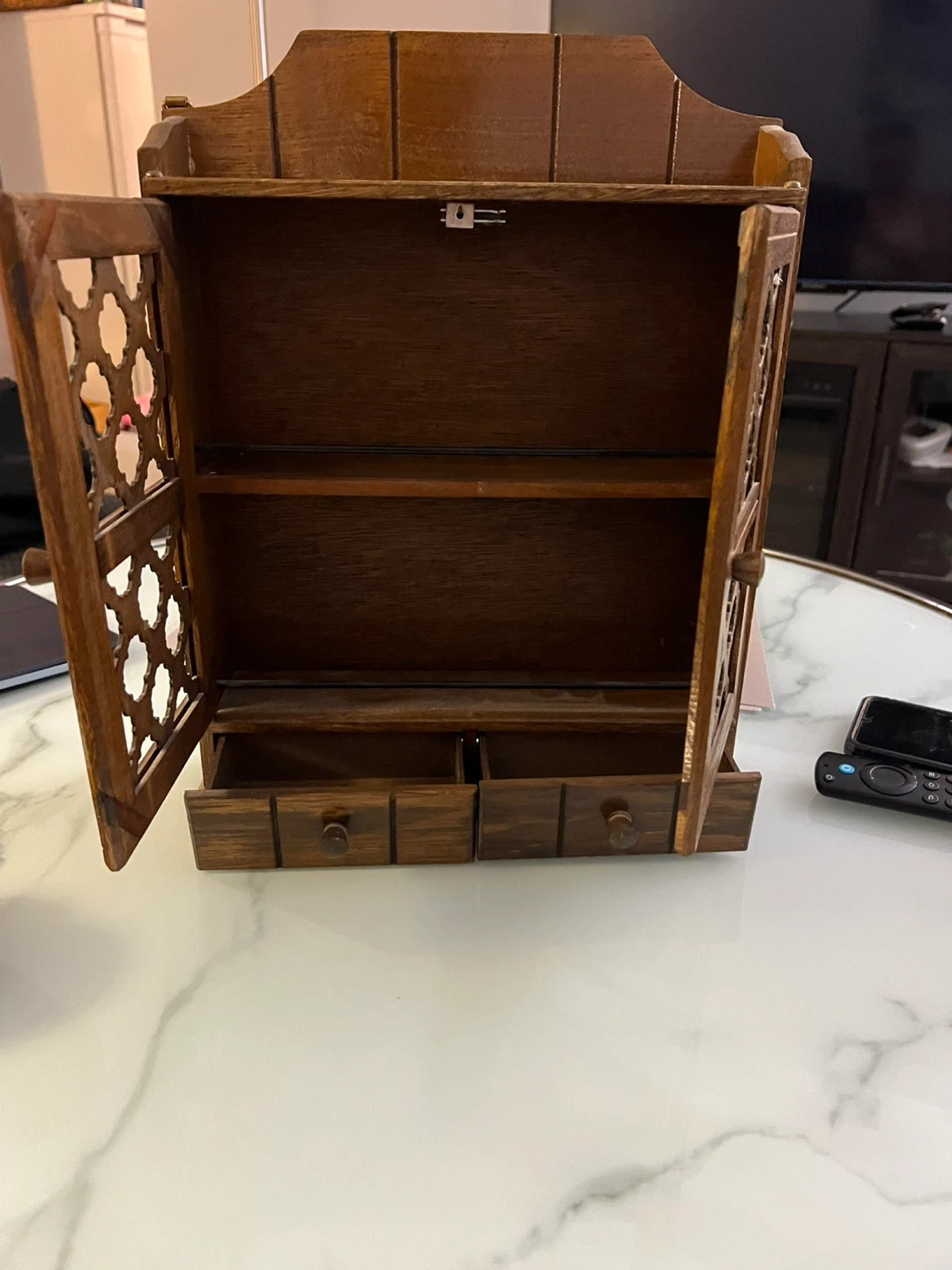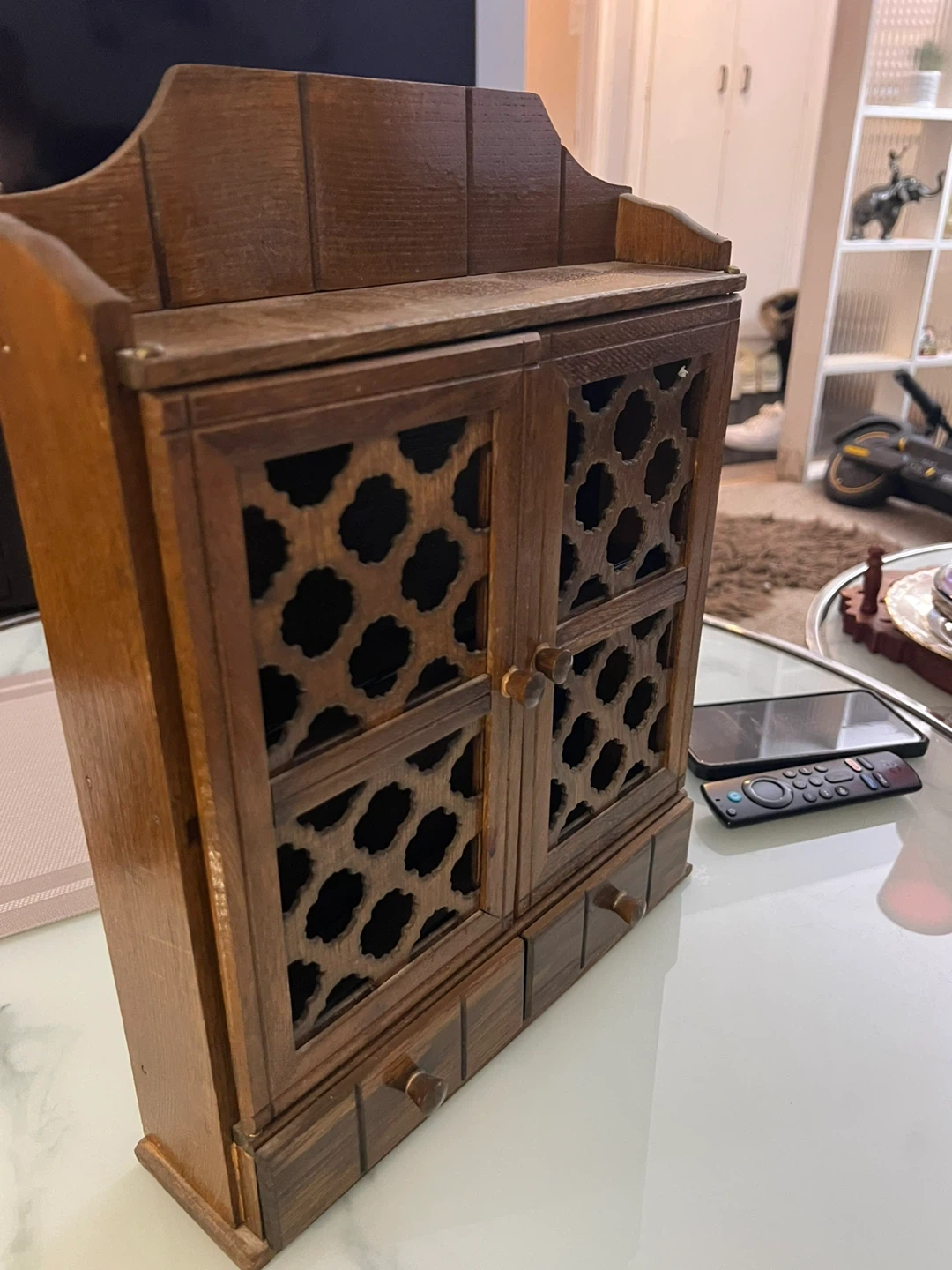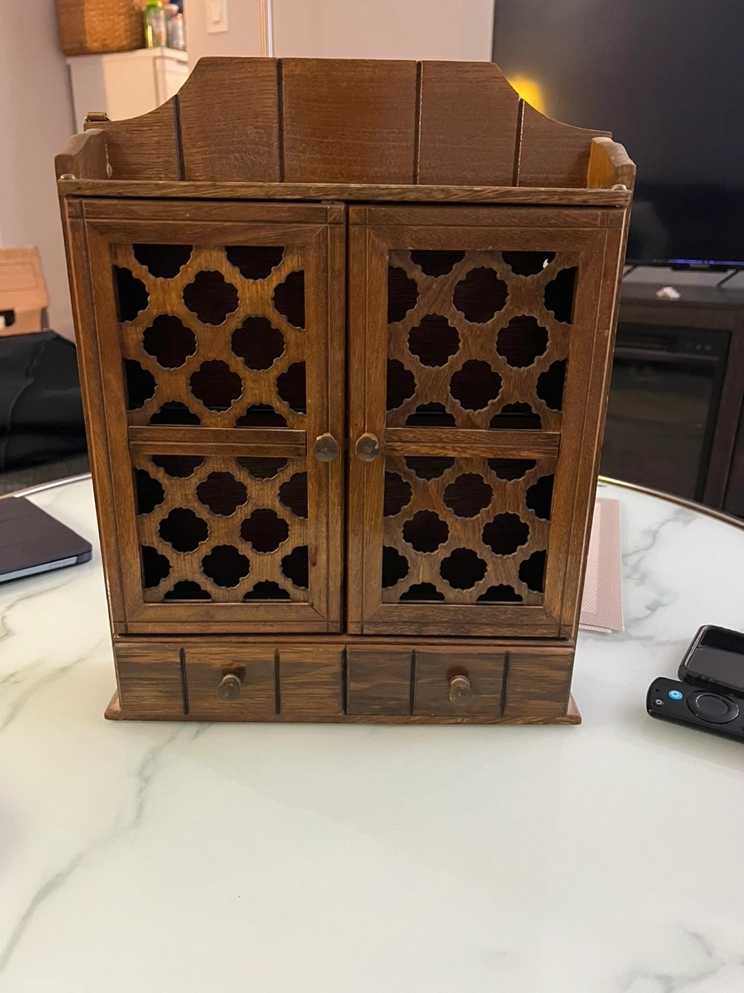 A lovely used vintage wooden cabinet with two doors and two drawers. It features a decorative lattice design on the doors. Perfect for storing small items or displaying trinkets. Made of wood.