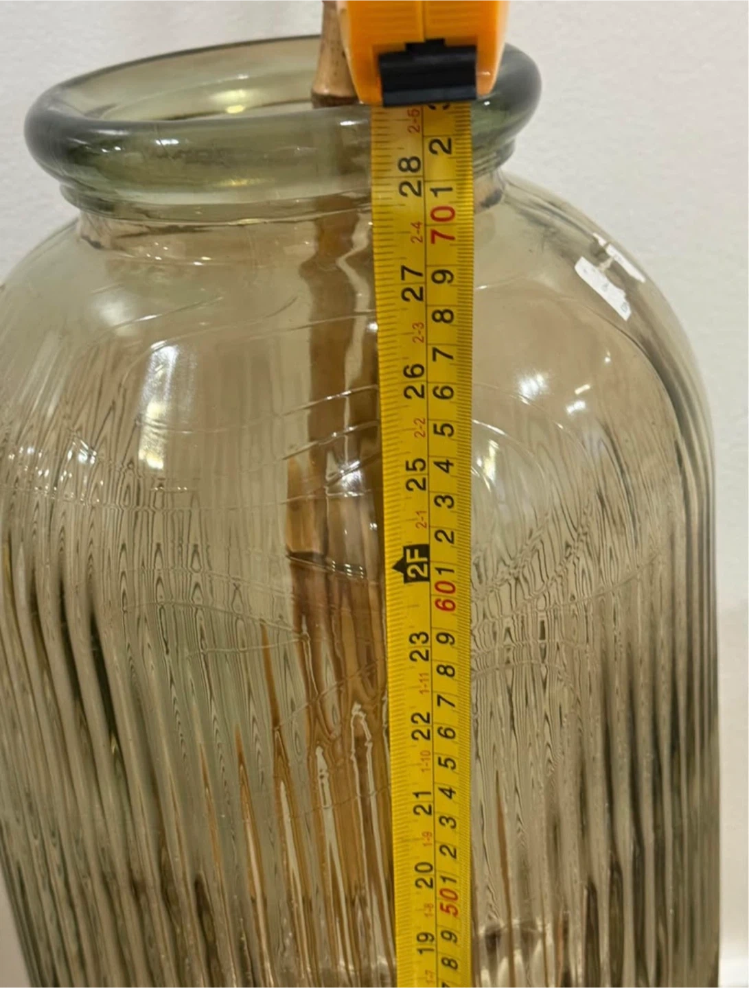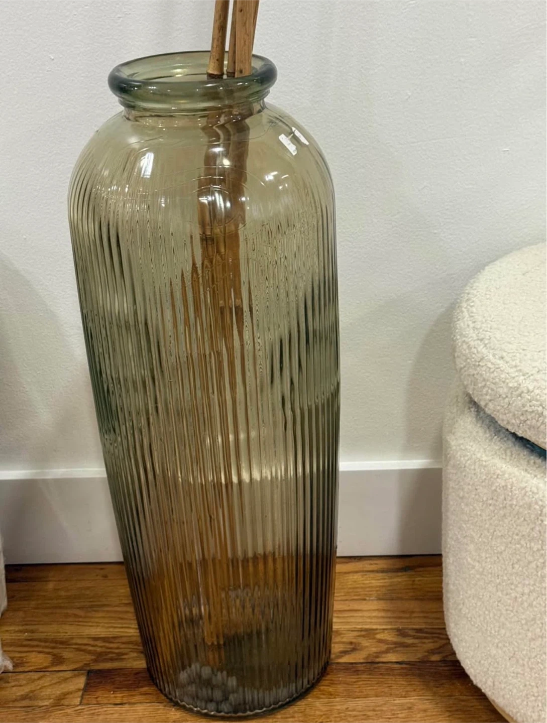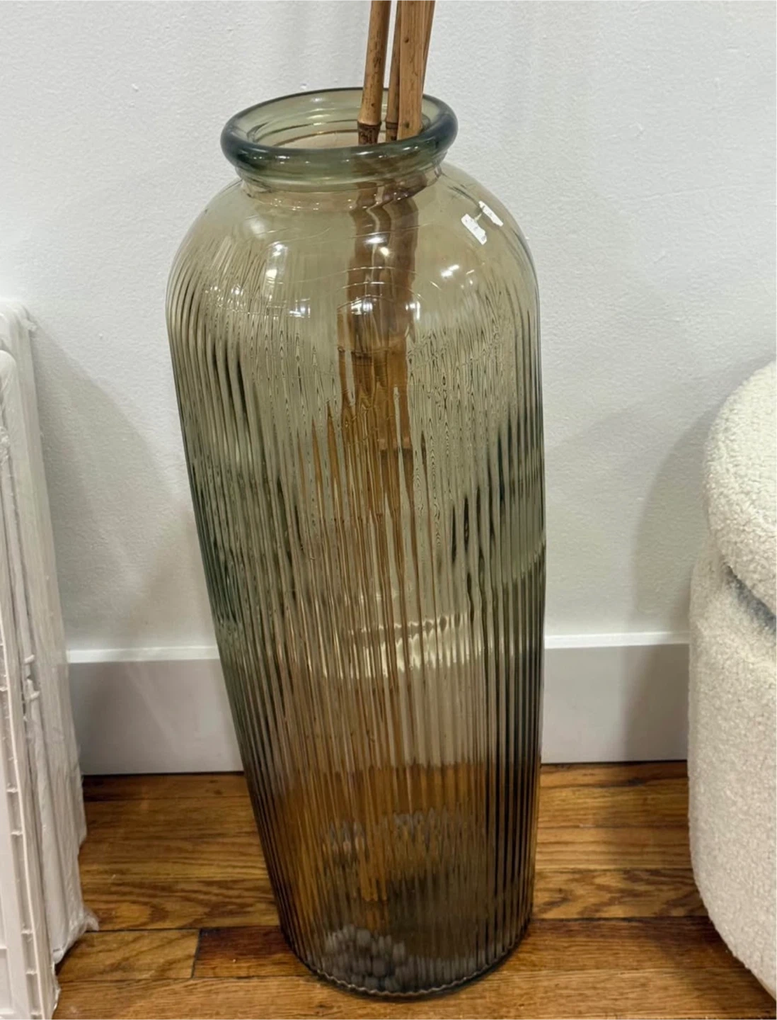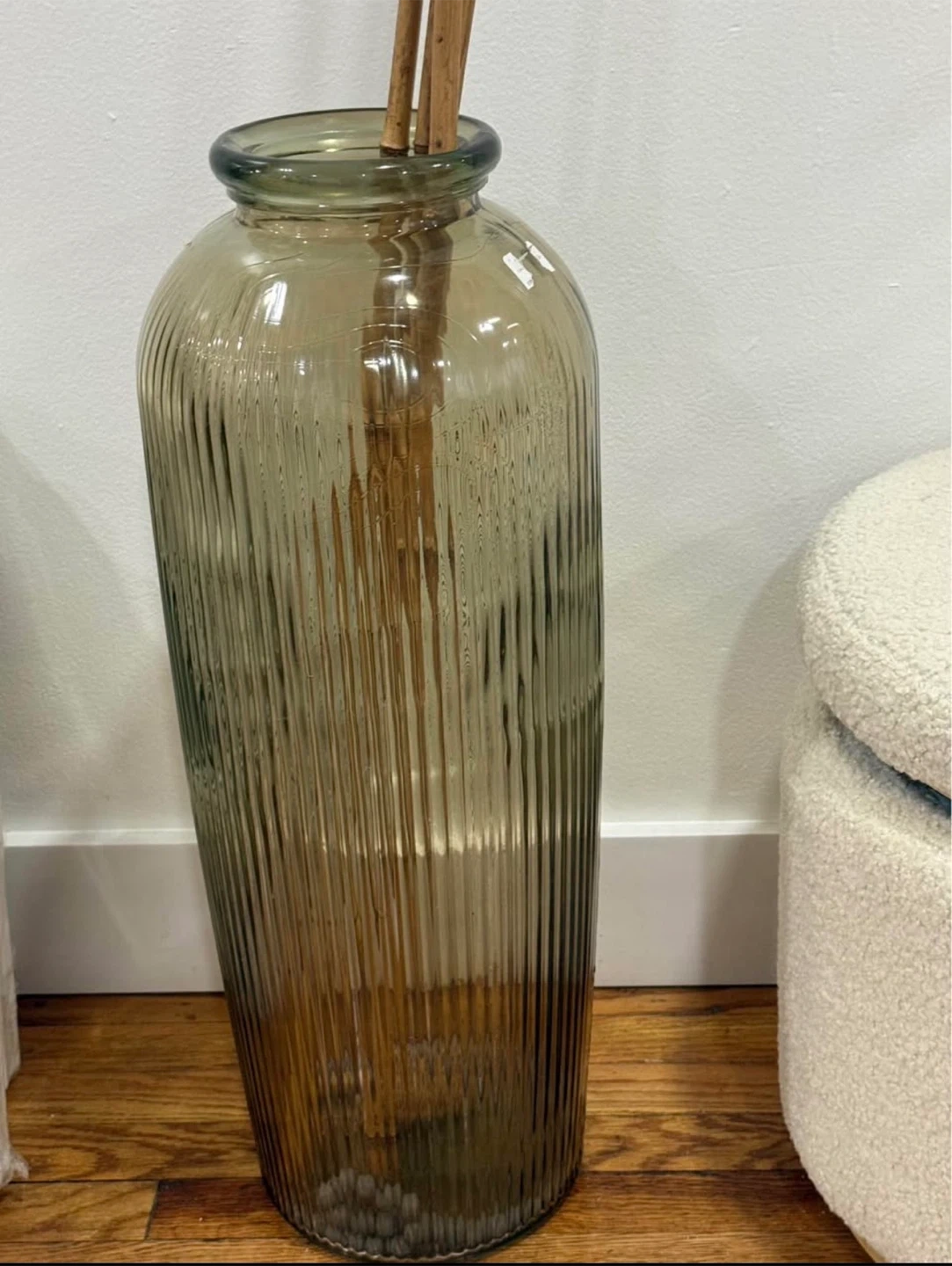 This tall, fluted glass vase has a smoky grey tint and measures approximately 28 inches high. The opening is about 6 inches in diameter. It comes with decorative wooden reeds inside. It's a beautiful piece for any room!