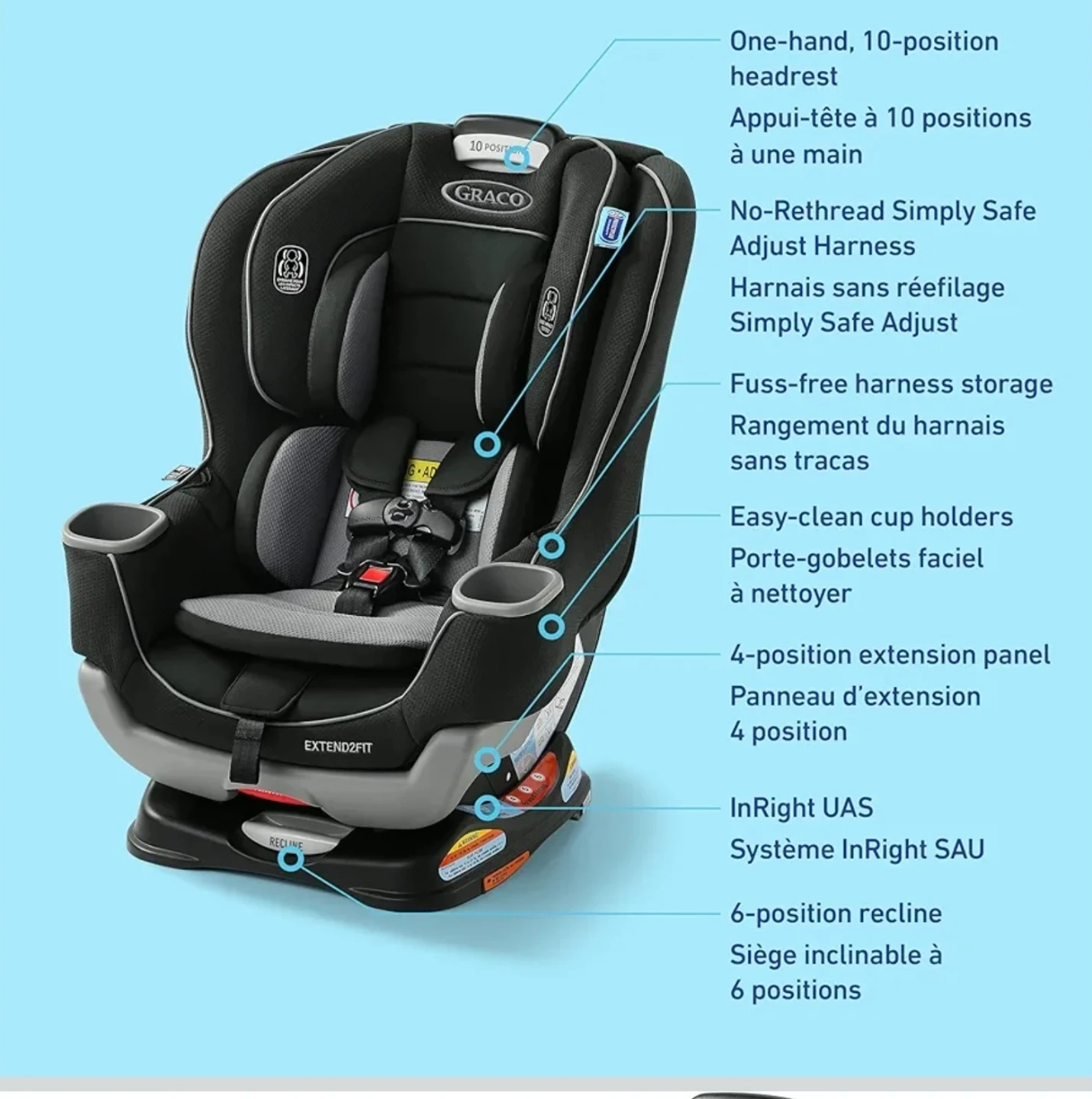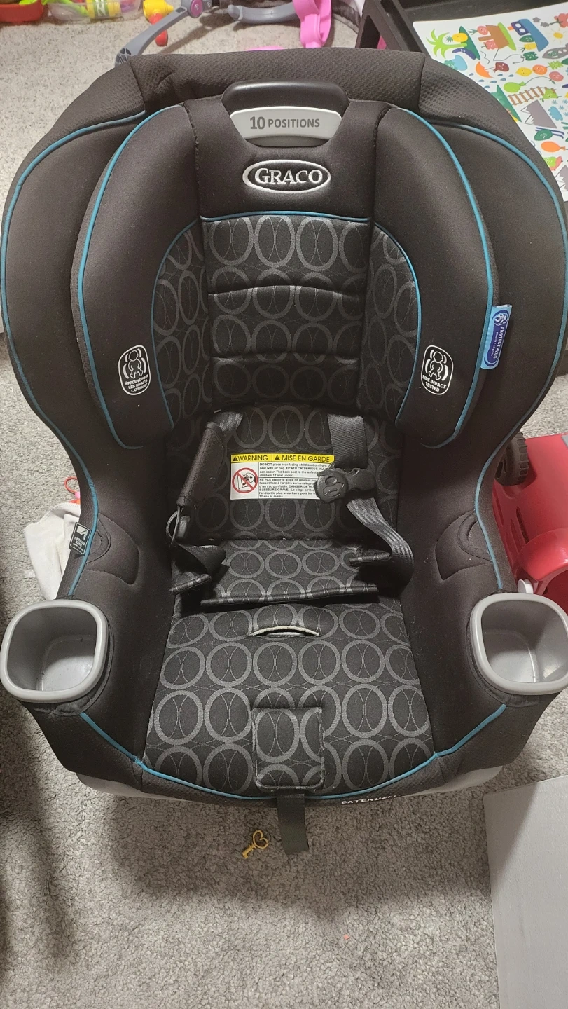 This Graco Extend2Fit convertible car seat offers 4-position extension for legroom. It features a 6-position recline and a 10-position headrest. The harness system is adjustable for growing kids.