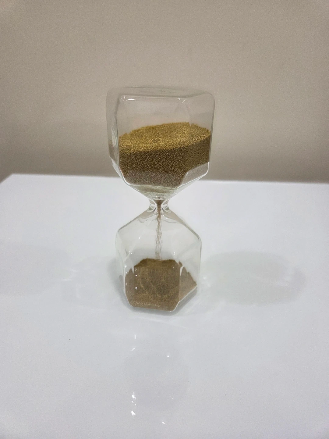 Glass hourglass filled with fine gold sand. It's a simple timer made of clear glass. This item could be useful for timing short activities or as a decorative piece.