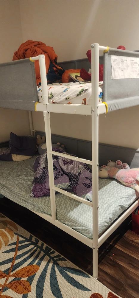 White Metal Bunk Bed with Grey Fabric Panels